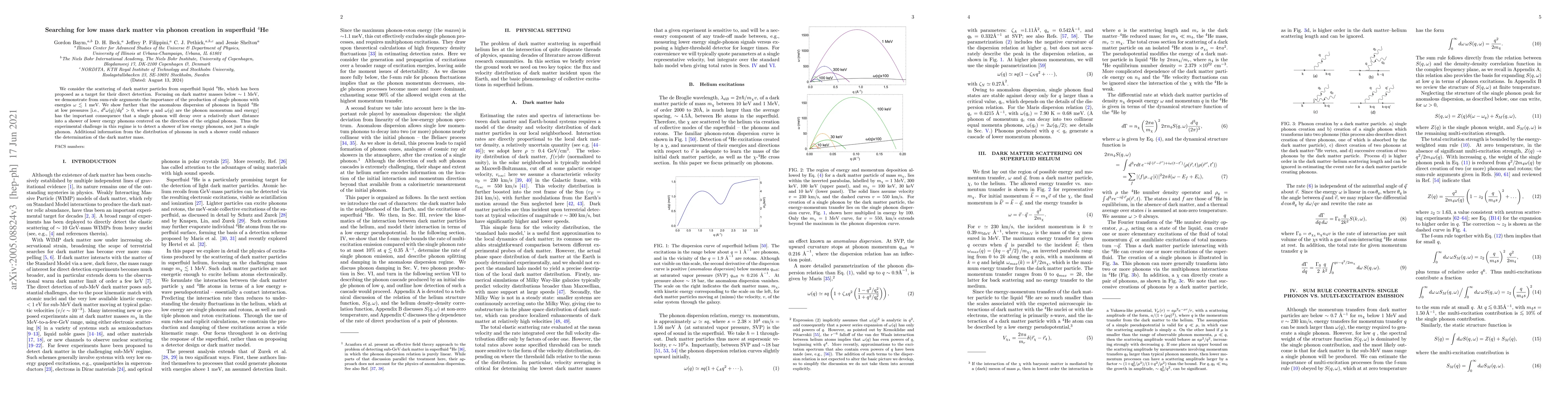 We consider the scattering of dark matter particles from superfluid liquid $^4$He, which has been proposed as a target for their direct detection. Focusing on dark matter masses below ~1 MeV, we demonstrate from sum-rule arguments the importance of the production of single phonons with energies $\omega \lesssim 1$ meV. We show further that the anomalous dispersion of phonons in liquid $^4$He at low pressures [i.e., $d^2\omega(q)/dq^2>0$, where $q$ and $\omega(q)$ are the phonon momentum and energy] has the important consequence that a single phonon will decay over a relatively short distance into a shower of lower energy phonons centered on the direction of the original phonon. Thus the experimental challenge in this regime is to detect a shower of low energy phonons, not just a single phonon. Additional information from the distribution of phonons in such a shower could enhance the determination of the dark matter mass.