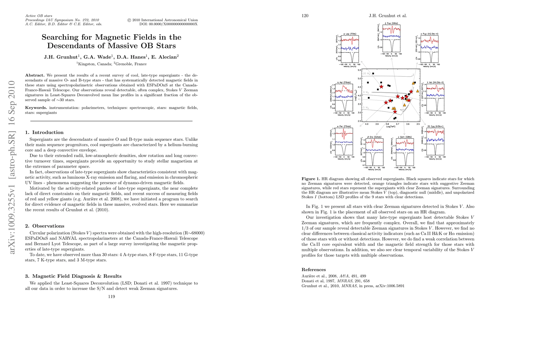 This study systematically detects magnetic fields in cool, late-type supergiants, the descendants of massive O- and B-type stars, using spectropolarimetric observations from ESPaDOnS at the Canada-France-Hawaii Telescope, revealing complex Zeeman signatures in a significant portion of the surveyed stars.