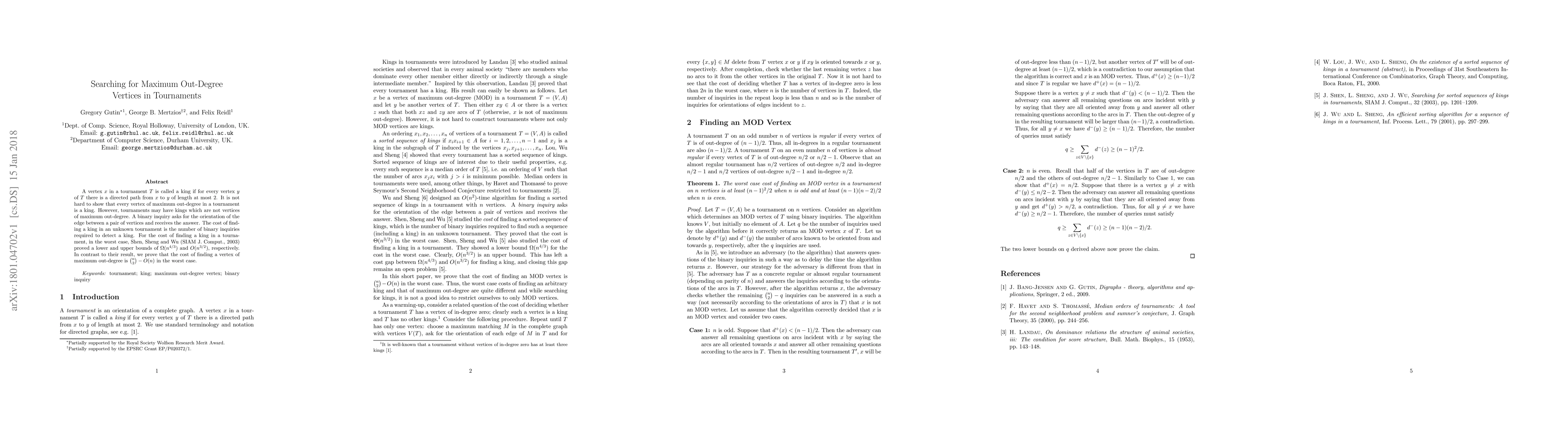 This paper investigates the problem of identifying vertices of maximum out-degree in tournaments, proving that the worst-case cost is ${n \choose 2} - O(n)$ binary inquiries, contrasting with previous results on finding kings which have a different complexity.