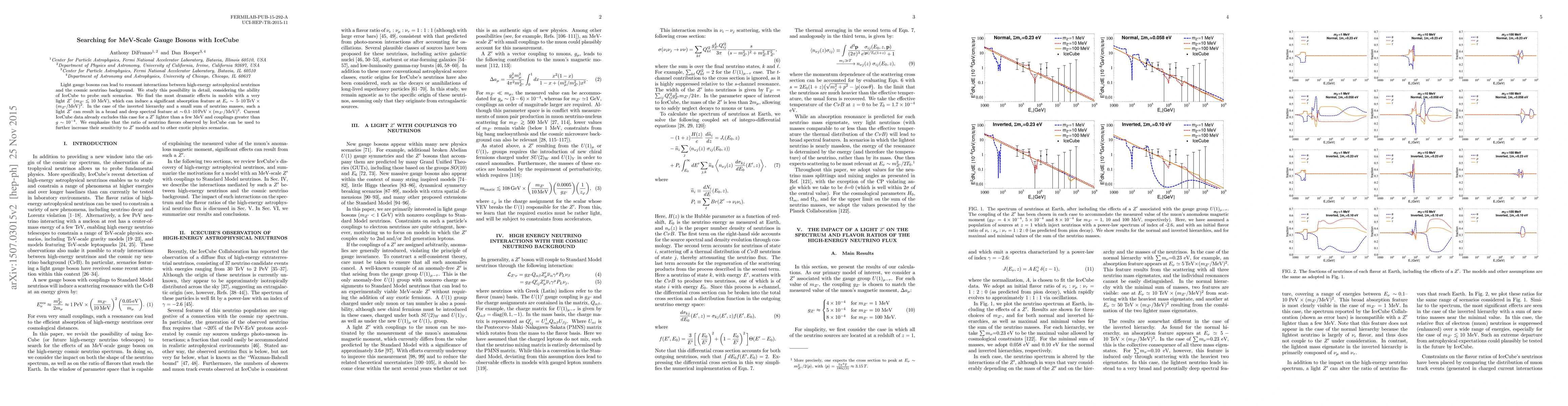 This paper investigates the potential for IceCube to detect MeV-scale gauge bosons ($Z'$) through resonant interactions with high-energy astrophysical neutrinos. Current IceCube data excludes $Z'$ bosons lighter than a few MeV with couplings greater than $g\sim10^{-4}$. The study highlights the potential for future analyses using the ratio of neutrino flavors to enhance sensitivity to such exotic physics.