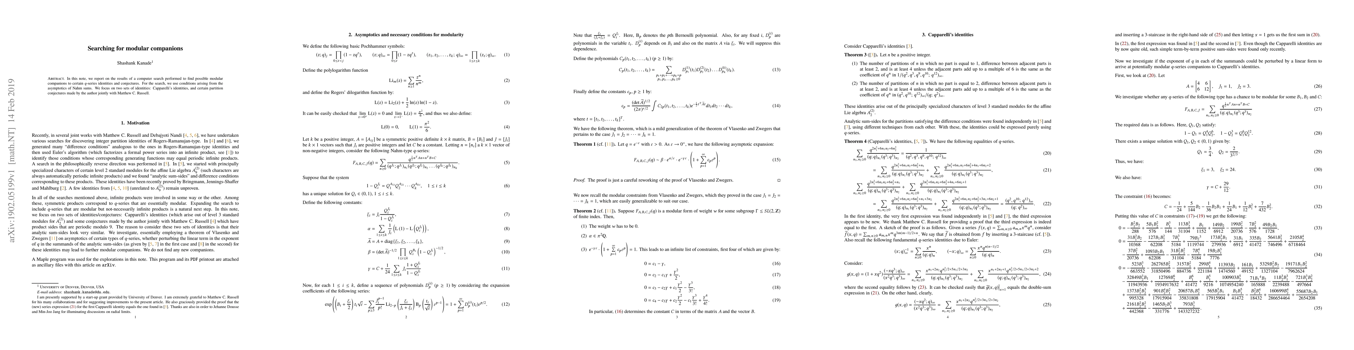 In this note, we report on the results of a computer search performed to find possible modular companions to certain $q$-series identities and conjectures. For the search, we use conditions arising from the asymptotics of Nahm sums. We focus on two sets of identities: Capparelli's identities, and certain partition conjectures made by the author jointly with Matthew C. Russell.