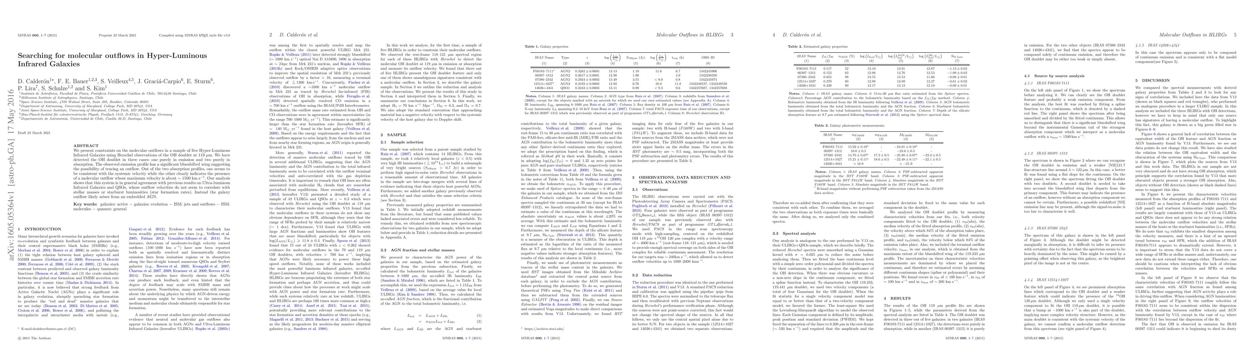 This paper investigates molecular outflows in five Hyper-Luminous Infrared Galaxies using Herschel observations of the OH doublet. It detects OH doublet in three galaxies, with one showing a blueshifted wing indicative of an outflow, and another revealing a molecular outflow with a velocity of ~1500 km/s, suggesting the presence of an embedded AGN rather than a starburst.