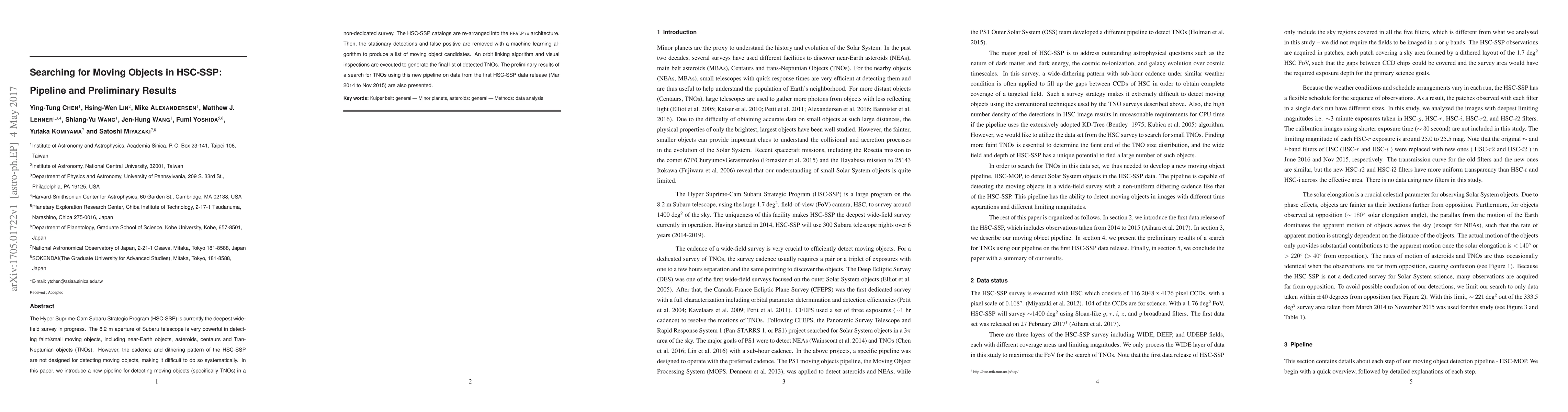 The Hyper Suprime-Cam Subaru Strategic Program (HSC-SSP) is currently the deepest wide- field survey in progress. The 8.2 m aperture of Subaru telescope is very powerful in detect- ing faint/small moving objects, including near-Earth objects, asteroids, centaurs and Tran- Neptunian objects (TNOs). However, the cadence and dithering pattern of the HSC-SSP are not designed for detecting moving objects, making it difficult to do so systematically. In this paper, we introduce a new pipeline for detecting moving objects (specifically TNOs) in a non-dedicated survey. The HSC-SSP catalogs are re-arranged into the HEALPix architecture. Then, the stationary detections and false positive are removed with a machine learning al- gorithm to produce a list of moving object candidates. An orbit linking algorithm and visual inspections are executed to generate the final list of detected TNOs. The preliminary results of a search for TNOs using this new pipeline on data from the first HSC-SSP data release (Mar 2014 to Nov 2015) are also presented.