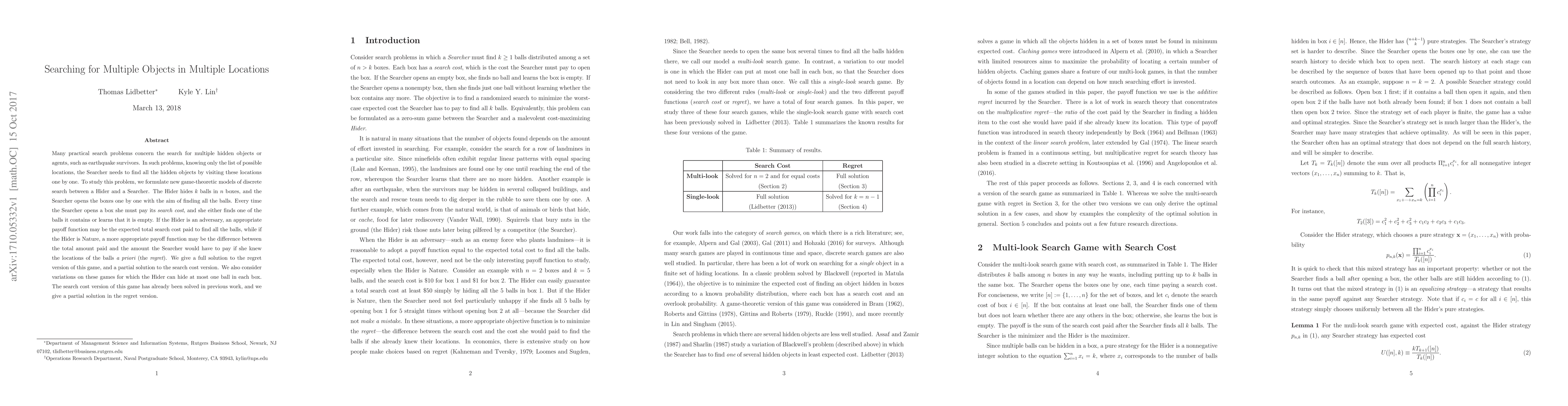 This paper formulates game-theoretic models for searching multiple hidden objects in multiple locations, distinguishing between adversarial and natural Hiders. It provides a full solution for the regret version and a partial solution for the search cost version, also exploring variations where each box can contain at most one ball.