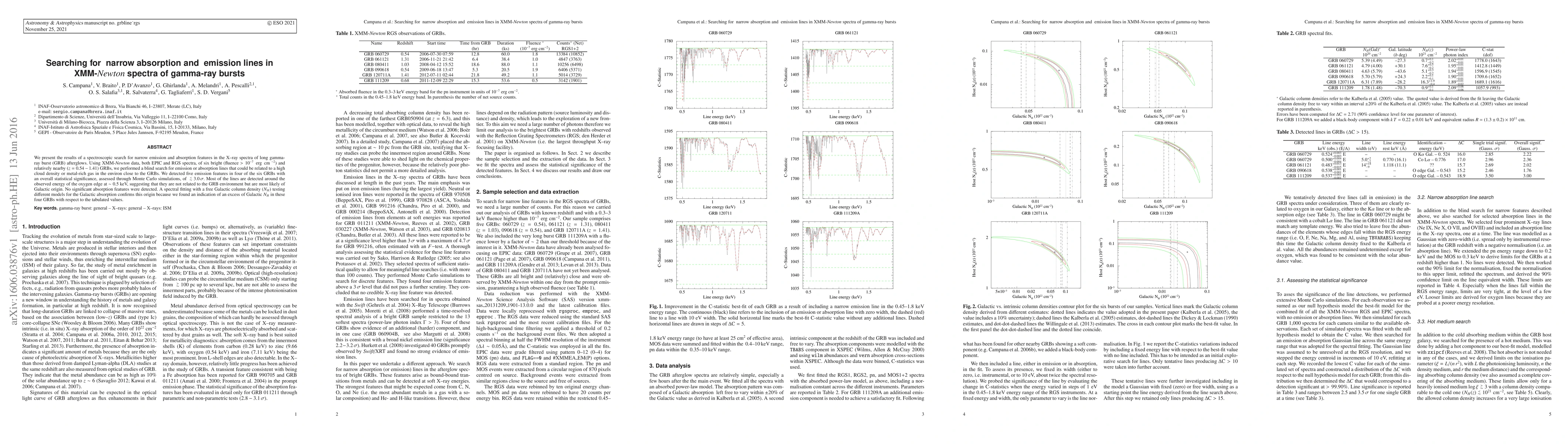 This study uses XMM-Newton data to search for narrow emission and absorption lines in the X-ray spectra of six long gamma-ray burst afterglows, finding five emission features likely of Galactic origin rather than related to the GRB environment. No significant absorption features were detected, supporting the idea of an excess of Galactic column density in these observations.