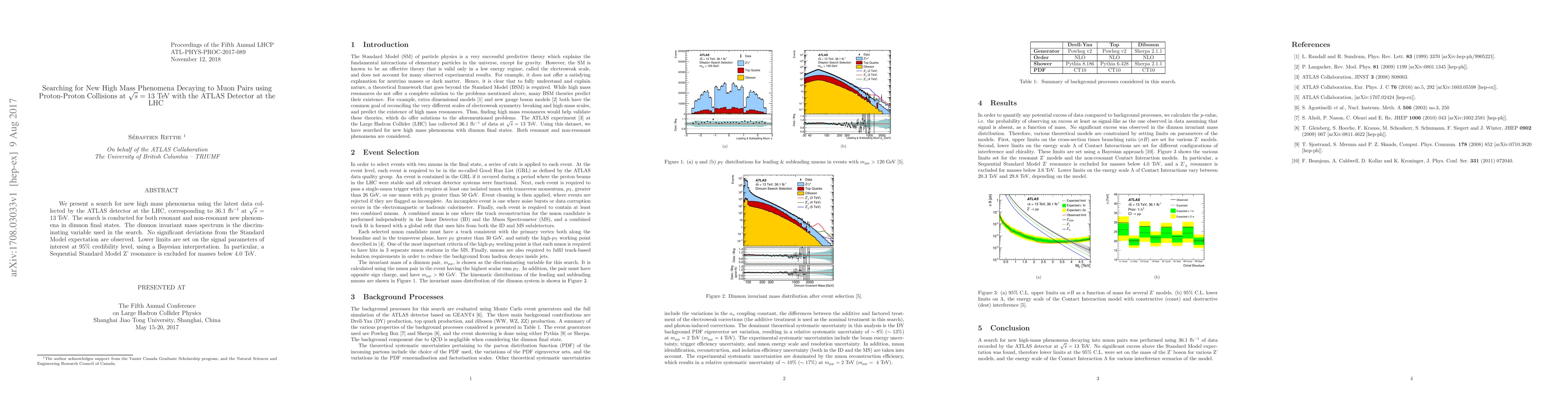 We present a search for new high mass phenomena using the latest data collected by the ATLAS detector at the LHC, corresponding to 36.1 fb$^{-1}$ at $\sqrt{s}$ = 13 TeV. The search is conducted for both resonant and non-resonant new phenomena in dimuon final states. The dimuon invariant mass spectrum is the discriminating variable used in the search. No significant deviations from the Standard Model expectation are observed. Lower limits are set on the signal parameters of interest at 95% credibility level, using a Bayesian interpretation. In particular, a Sequential Standard Model Z' resonance is excluded for masses below 4.0 TeV.