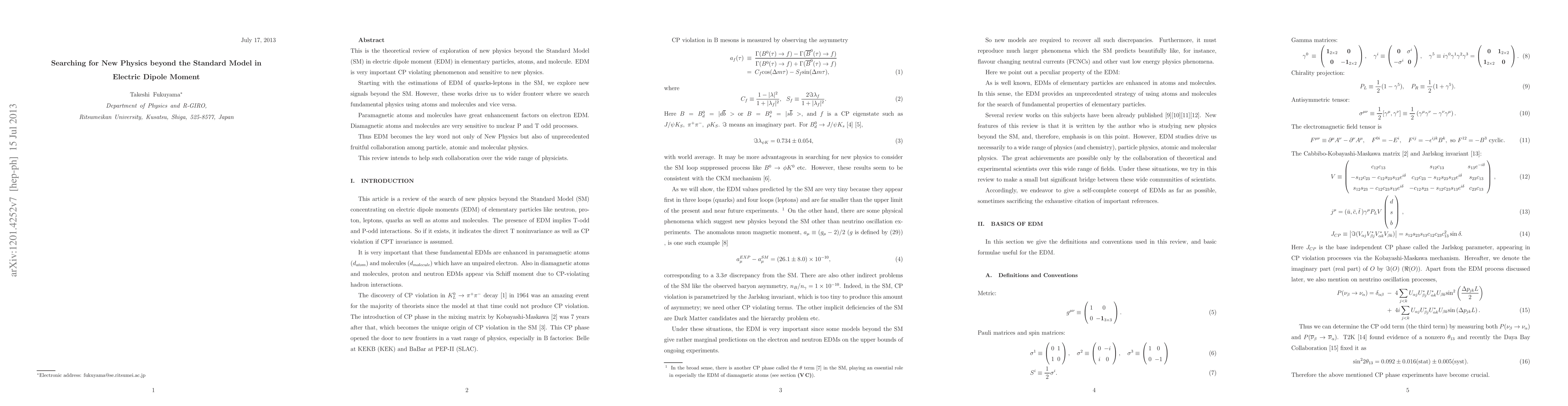 This is a theoretical review of exploration of new physics beyond the Standard Model (SM) in electric dipole moment (EDM) in elementary particles, atoms, and molecule. EDM is a very important CP violating phenomenon and sensitive to new physics. Starting with the estimations of EDM of quarks-leptons in the SM, we explore the new signals beyond the SM. However, these works drive us to more wide fronteers where we serach fundamental physics using atoms and molecules and vice versa. Paramagnetic atoms and molecules have great enhancement factor on electron EDM. Diamagnetic atoms and molecules are very sensitive to nuclear P and T odd processes. Thus the EDM becomes the key word not only of New Physics but also of unprecedented fruitful collaboration among particle, atomic. molecular physics. This review intends to help such collaboration over the wide range of physicists.