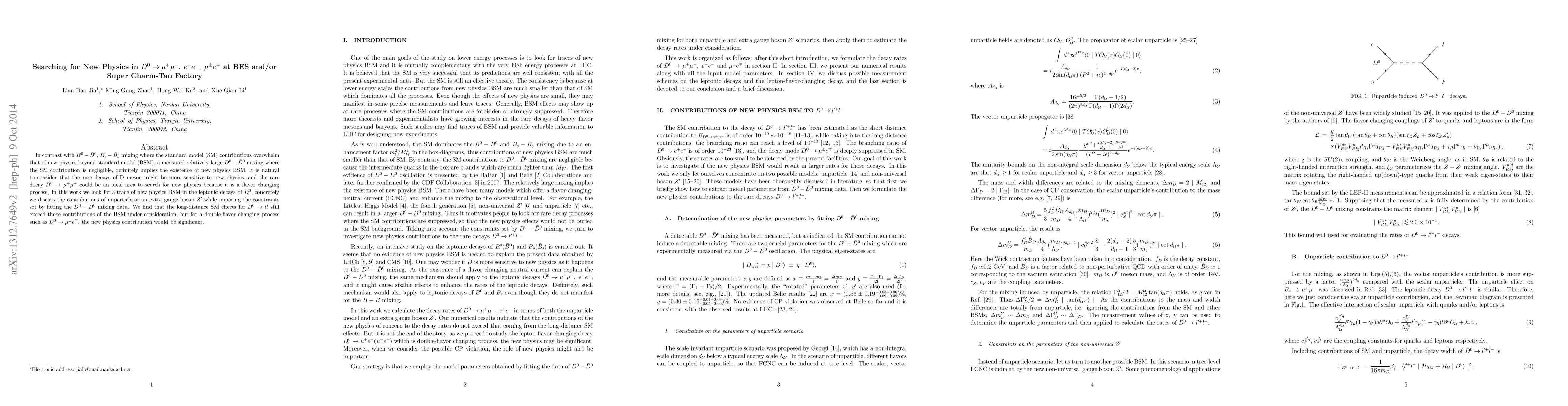 In contrast with $B^0-\bar B^0$, $B_s-\bar B_s$ mixing where the standard model (SM) contributions overwhelm that of new physics beyond standard model (BSM), a measured relatively large $D^0-\bar D^0$ mixing where the SM contribution is negligible, definitely implies the existence of new physics BSM. It is natural to consider that the rare decays of D meson might be more sensitive to new physics, and the rare decay $D^0\to \mu^+\mu^-$ could be an ideal area to search for new physics because it is a flavor changing process. In this work we look for a trace of new physics BSM in the leptonic decays of $D^0$, concretely we discuss the contributions of unparticle or an extra gauge boson $Z'$ while imposing the constraints set by fitting the $D^0-\bar D^0$ mixing data. We find that the long-distance SM effects for $D^0\to l\bar l$ still exceed those contributions of the BSM under consideration, but for a double-flavor changing process such as $D^0\to \mu^{\pm}e^{\mp}$, the new physics contribution would be significant.