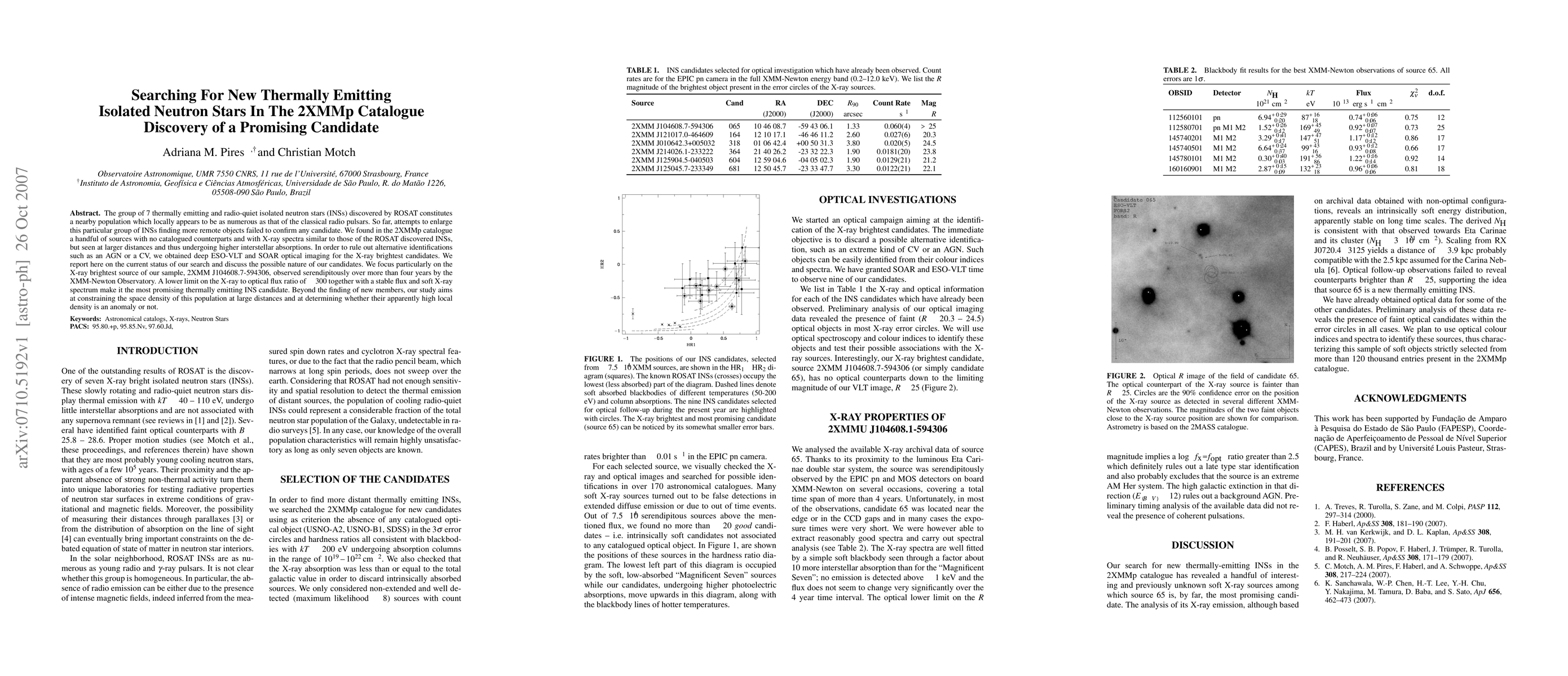 The research identifies a promising candidate, 2XMM J104608.7-594306, for a thermally emitting, radio-quiet isolated neutron star using data from the 2XMMp catalogue. Deep optical imaging from ESO-VLT and SOAR telescopes ruled out alternative identifications. The candidate's high X-ray to optical flux ratio and stable, soft spectrum suggest it could be a member of the nearby population of such neutron stars, aiming to constrain their space density at larger distances.