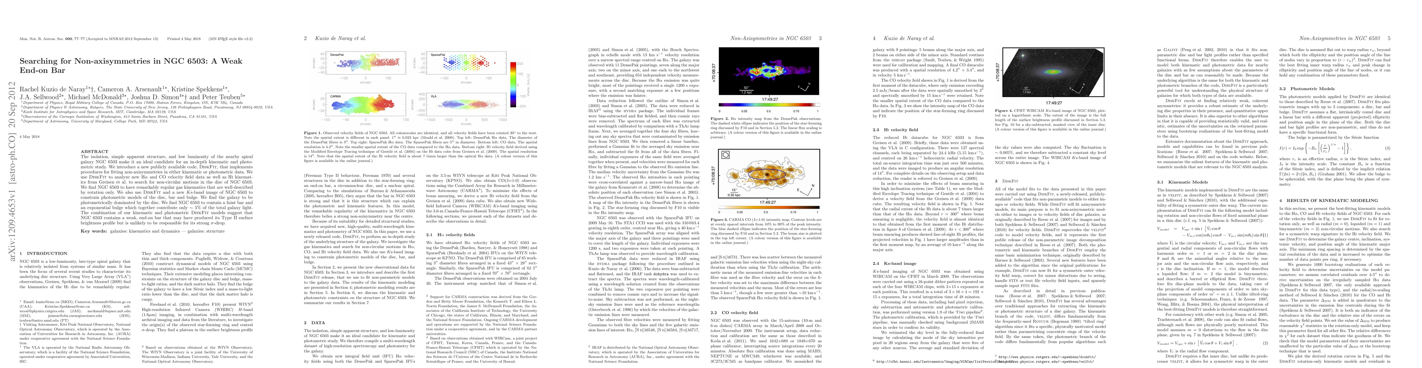 The isolation, simple apparent structure, and low luminosity of the nearby spiral galaxy NGC 6503 make it an ideal candidate for an in-depth kinematic and photometric study. We introduce a new publicly available code, DiskFit, that implements procedures for fitting non-axisymmetries in either kinematic or photometric data. We use DiskFit to analyze new Halpha and CO velocity field data as well as HI kinematics from Greisen et al. to search for non-circular motions in the disc of NGC 6503. We find NGC 6503 to have remarkably regular gas kinematics that are well-described by rotation only. We also use DiskFit and a new Ks-band image of NGC 6503 to constrain photometric models of the disc, bar and bulge. We find the galaxy to be photometrically dominated by the disc. We find NGC 6503 to contain a faint bar and an exponential bulge which together contribute only ~5% of the total galaxy light. The combination of our kinematic and photometric DiskFit models suggest that NGC 6503 contains a weak, end-on bar that may have produced its Type II surface brightness profile but is unlikely to be responsible for its strong sigma-drop.