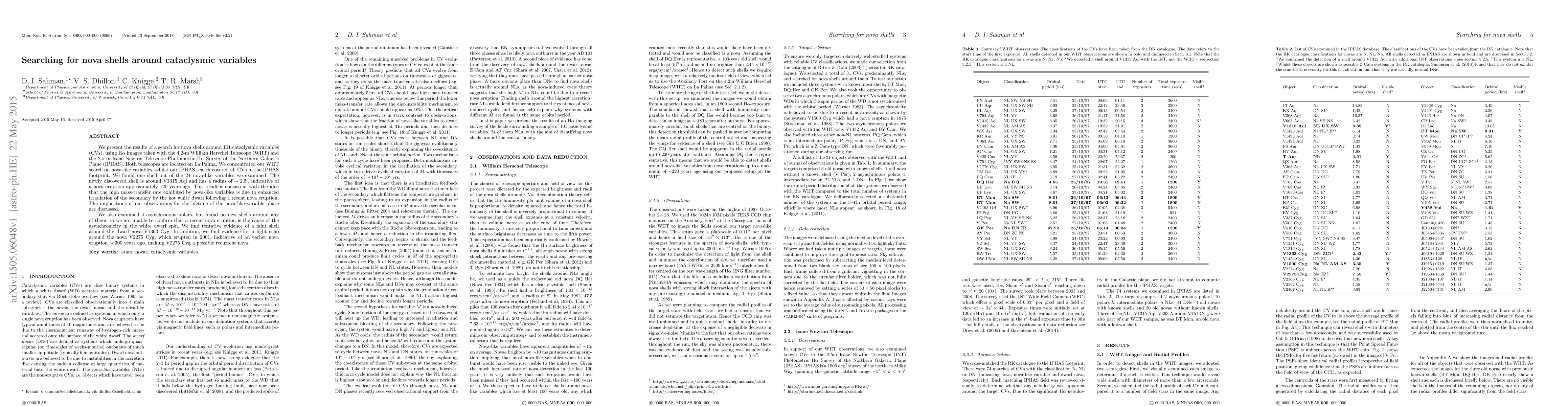 We present the results of a search for nova shells around 101 cataclysmic variables (CVs), using Halpha images taken with the 4.2-m William Herschel Telescope (WHT) and the 2.5-m Isaac Newton Telescope Photometric Halpha Survey of the Northern Galactic Plane (IPHAS). Both telescopes are located on La Palma. We concentrated our WHT search on nova-like variables, whilst our IPHAS search covered all CVs in the IPHAS footprint. We found one shell out of the 24 nova-like variables we examined. The newly discovered shell is around V1315 Aql and has a radius of approx.2.5 arcmin, indicative of a nova eruption approximately 120 years ago. This result is consistent with the idea that the high mass-transfer rate exhibited by nova-like variables is due to enhanced irradiation of the secondary by the hot white dwarf following a recent nova eruption. The implications of our observations for the lifetime of the nova-like variable phase are discussed. We also examined 4 asynchronous polars, but found no new shells around any of them, so we are unable to confirm that a recent nova eruption is the cause of the asynchronicity in the white dwarf spin. We find tentative evidence of a faint shell around the dwarf nova V1363 Cyg. In addition, we find evidence for a light echo around the nova V2275 Cyg, which erupted in 2001, indicative of an earlier nova eruption approx.300 years ago, making V2275 Cyg a possible recurrent nova.