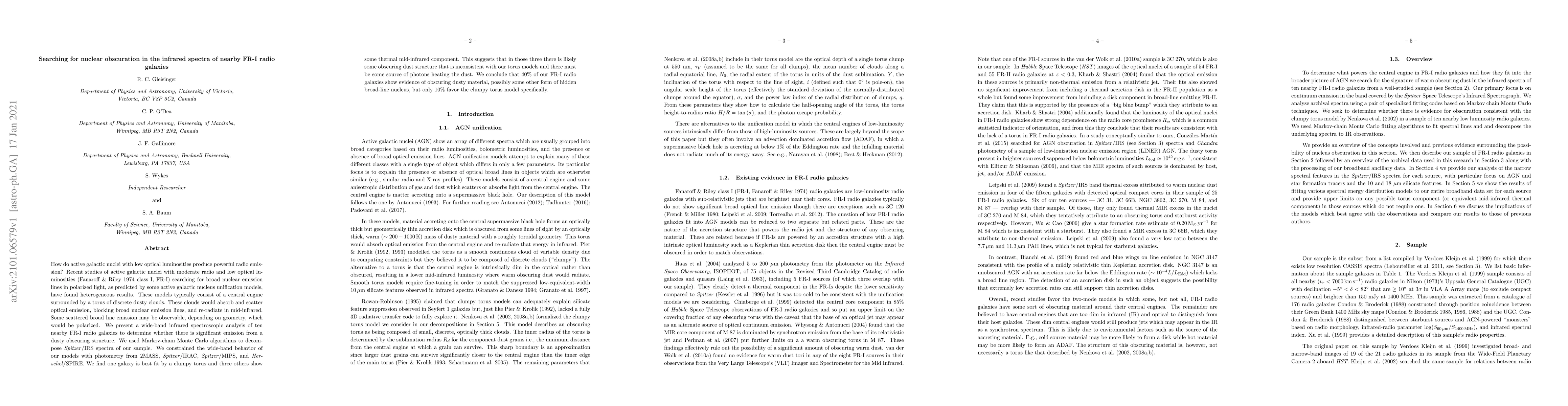 How do active galactic nuclei with low optical luminosities produce powerful radio emission? Recent studies of active galactic nuclei with moderate radio and low optical luminosities (Fanaroff & Riley class I, FR I) searching for broad nuclear emission lines in polarized light, as predicted by some active galactic nucleus unification models, have found heterogeneous results. These models typically consist of a central engine surrounded by a torus of discrete dusty clouds. These clouds would absorb and scatter optical emission, blocking broad nuclear emission lines, and reradiate in mid-infrared. Some scattered broad-line emission may be observable, depending on geometry, which would be polarized. We present a wide-band infrared spectroscopic analysis of 10 nearby FR I radio galaxies to determine whether there is significant emission from a dusty obscuring structure. We used Markov Chain Monte Carlo algorithms to decompose Spitzer/IRS spectra of our sample. We constrained the wide-band behavior of our models with photometry from the Two Micron All Sky Survey, Spitzer/IRAC, Spitzer/MIPS, and Herschel/SPIRE. We find that one galaxy is best fit by a clumpy torus and three others show some thermal mid-infrared component. This suggests that in those three there is likely some obscuring dust structure that is inconsistent with our torus models and there must be some source of photons heating the dust. We conclude that 40% of our FR I radio galaxies show evidence of obscuring dusty material, possibly some other form of hidden broad-line nucleus, but only 10% favor the clumpy torus model specifically.