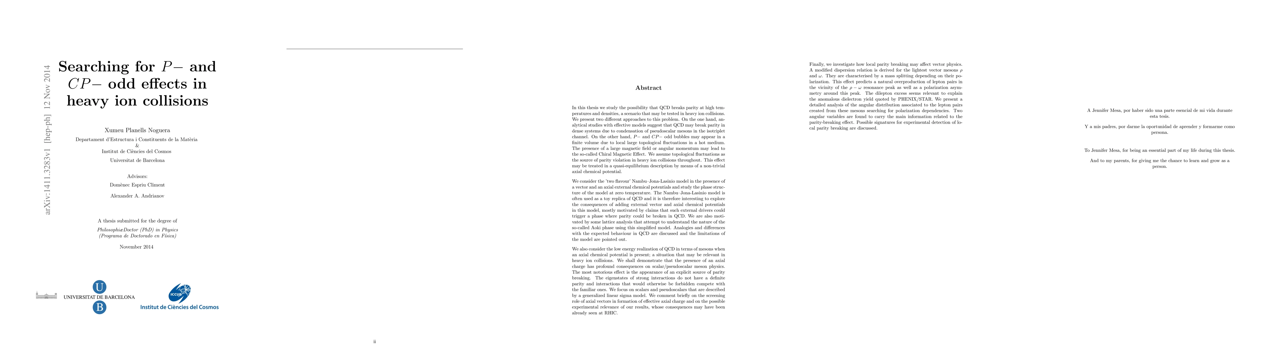 In this thesis we study the possibility that QCD breaks parity at high temperatures and densities, a scenario that may be tested in heavy ion collisions. Analytical studies with effective models suggest that QCD may break parity in dense systems. Besides, P- and CP- odd bubbles may appear in a finite volume due to local large topological fluctuations in a hot medium. The last effect may be treated in a quasi-equilibrium description by means of a non-trivial axial chemical potential. We consider the 'two flavour' Nambu--Jona-Lasinio model in the presence of a vector and an axial external chemical potentials and study the phase structure of the model at zero temperature. These magnitudes could trigger a phase where parity could be broken in QCD. Analogies and differences with the expected behaviour in QCD are discussed besides the limitations of the model. We also consider the low energy realization of QCD in terms of mesons when an axial chemical potential is present. The eigenstates of strong interactions do not have a definite parity and interactions that would otherwise be forbidden compete with the familiar ones. We focus on scalars and pseudoscalars that are described by a generalized linear sigma model. Finally, we investigate how local parity breaking may affect vector physics. A modified dispersion relation is derived for the lightest vector mesons rho and omega. This effect predicts a natural overproduction of lepton pairs in the vicinity of the rho-omega resonance peak as well as a polarization asymmetry around this peak. The dilepton excess seems relevant to explain the anomalous dielectron yield quoted by PHENIX/STAR. We present a detailed analysis of the angular distribution associated to the lepton pairs created from these mesons searching for polarization dependencies. Two angular variables are found to carry the main information related to the parity-breaking effect.