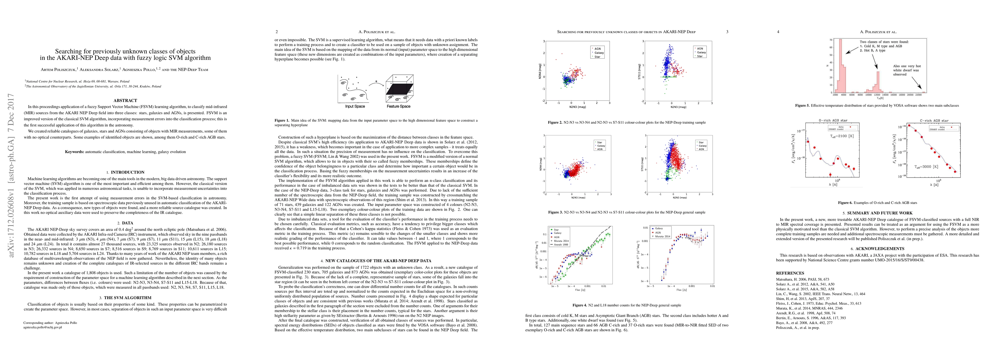 In this proceedings application of a fuzzy Support Vector Machine (FSVM) learning algorithm, to classify mid-infrared (MIR) sources from the AKARI NEP Deep field into three classes: stars, galaxies and AGNs, is presented. FSVM is an improved version of the classical SVM algorithm, incorporating measurement errors into the classification process; this is the first successful application of this algorithm in the astronomy. We created reliable catalogues of galaxies, stars and AGNs consisting of objects with MIR measurements, some of them with no optical counterparts. Some examples of identified objects are shown, among them O-rich and C-rich AGB stars.