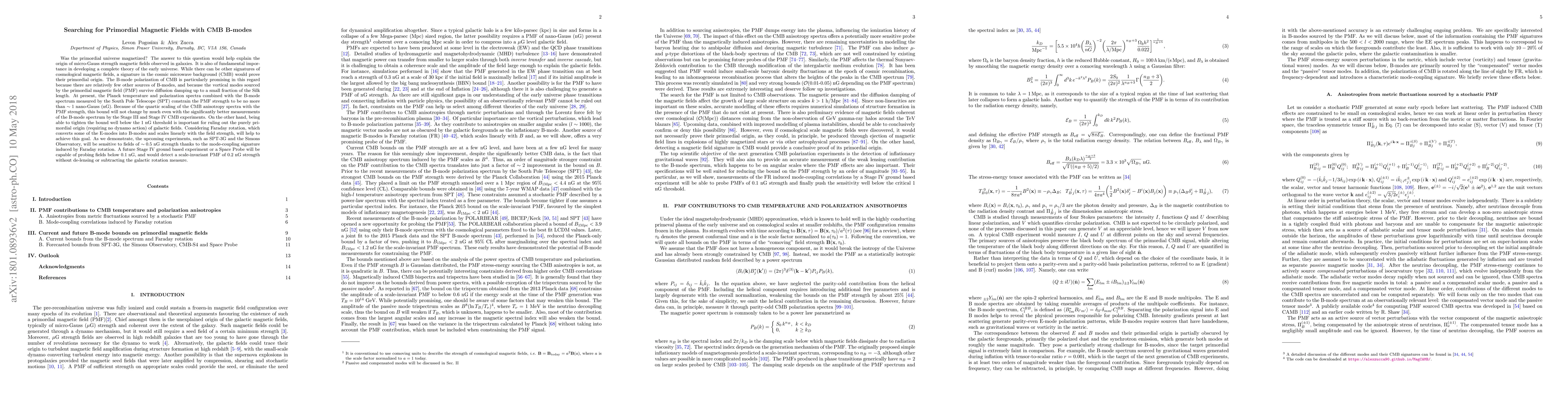 This paper investigates the potential detection of primordial magnetic fields (PMF) through the B-mode polarization of the cosmic microwave background (CMB). Current constraints from Planck and SPT data suggest PMFs are no stronger than 1 nano-Gauss, but future experiments like SPT-3G and the Simons Observatory could detect fields as low as 0.5 nG, potentially ruling out purely primordial origins of galactic magnetic fields.