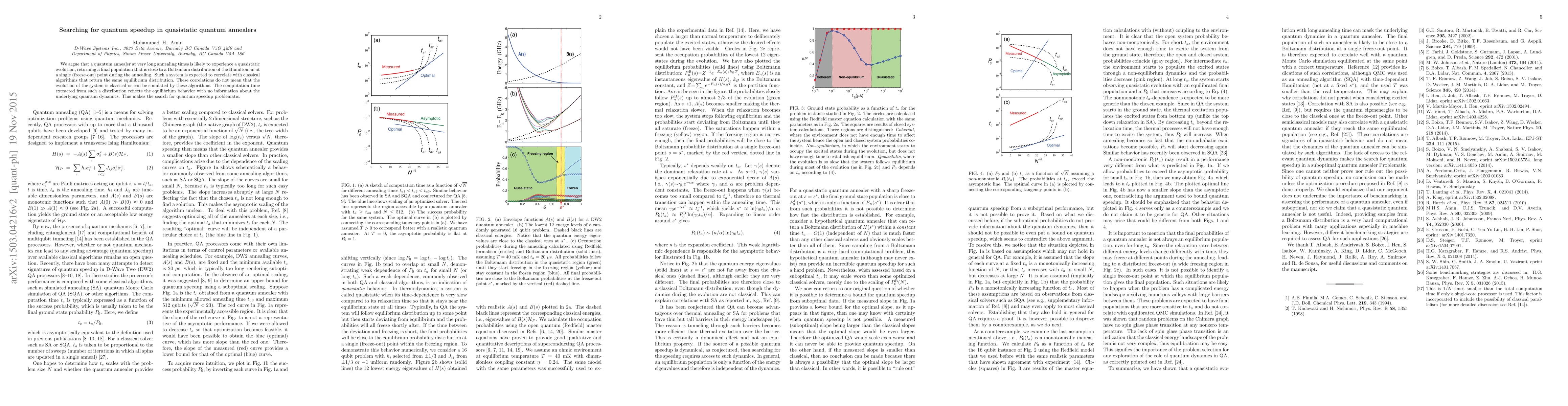 We argue that a quantum annealer at very long annealing times is likely to experience a quasistatic evolution, returning a final population that is close to a Boltzmann distribution of the Hamiltonian at a single (freeze-out) point during the annealing. Such a system is expected to correlate well with a proper quantum Monte Carlo simulation. It may also correlate with simulated annealing if at the freeze-out point the quantum energy eigenvalues are close to the classical ones. These correlations are just signatures of equilibration and do not mean that the evolution of the quantum annealer is classical or can be simulated by quantum Monte Carlo. The computation time extracted from such a distribution reflects the equilibrium behavior and therefore provides no information about the underlying quantum dynamics. This makes the search for quantum speedup in suboptimal quantum annealers problematic. We use an open quantum master equation with realistic parameters to illustrate quasistatic evolution in a 16 qubit quantum annealer and discuss its implication for quantum speedup.