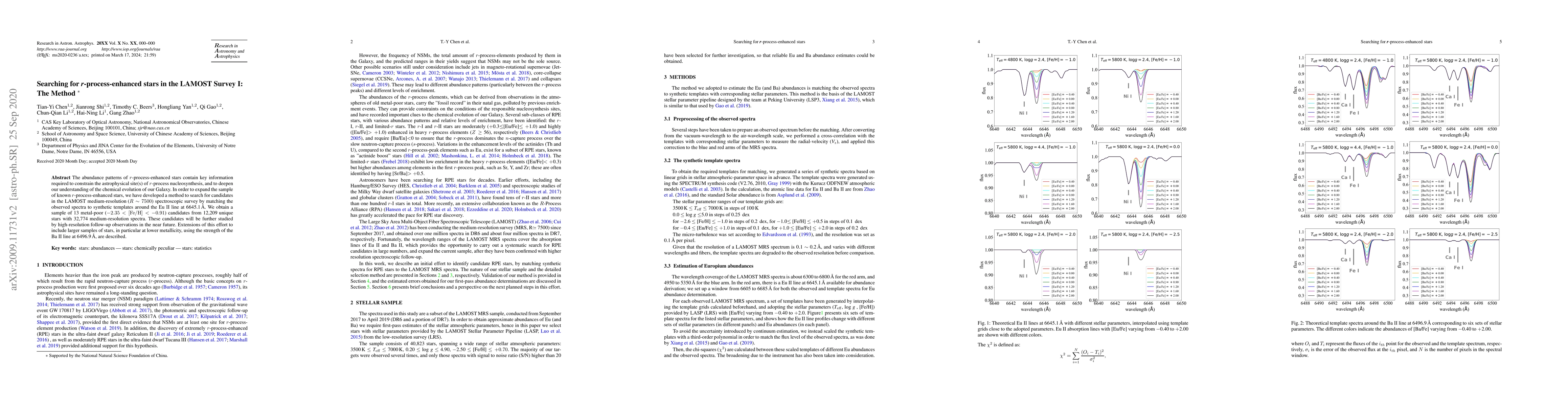 This paper introduces a method to identify r-process-enhanced stars in the LAMOST spectroscopic survey by comparing observed spectra to synthetic templates near the Eu II line at 6645.1 AA. The method successfully pinpointed 13 metal-poor candidates from 12,209 unique stars, which will be further investigated with high-resolution observations. The approach also outlines future plans to expand the search using the Ba II line at 6496.9 AA, particularly at lower metallicities.
