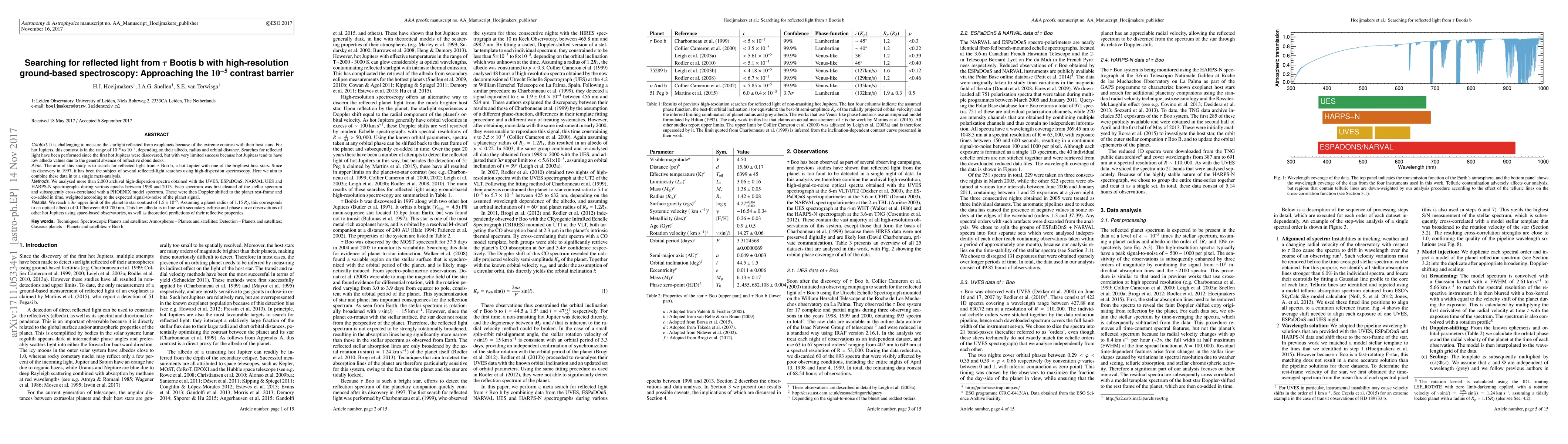 Researchers conducted a meta-analysis of archival spectroscopy data to search for reflected light from $ au$ Boo b, a hot Jupiter with one of the brightest host stars, and found a 3$ au$ upper limit of $1.5 imes 10^{-5}$ contrast barrier.