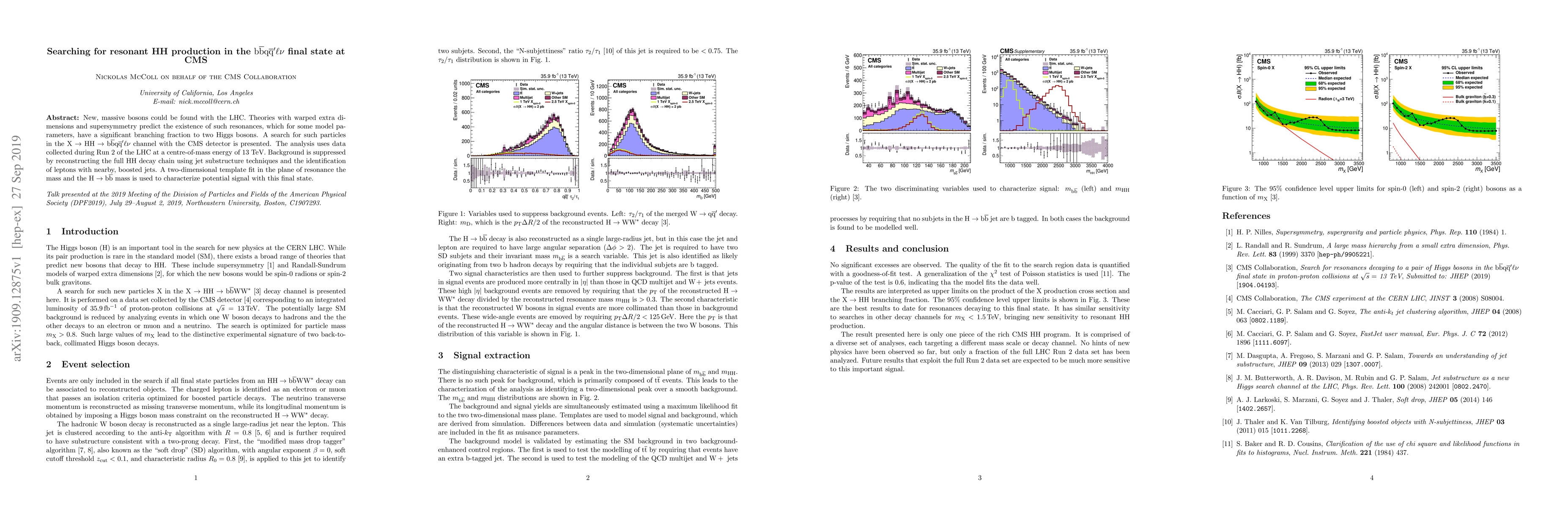 New, massive bosons could be found with the LHC. Theories with warped extra dimensions and supersymmetry predict the existence of such resonances, which for some model parameters, have a significant branching fraction to two Higgs bosons. A search for such particles in the $\mathrm{X}\rightarrow\mathrm{HH}\rightarrow\mathrm{b\overline{b}q\overline{q}'}\ell\nu$ channel with the CMS detector is presented. The analysis uses data collected during Run 2 of the LHC at a centre-of-mass energy of 13 TeV. Background is suppressed by reconstructing the full $\mathrm{HH}$ decay chain using jet substructure techniques and the identification of leptons with nearby, boosted jets. A two-dimensional template fit in the plane of resonance the mass and the $\mathrm{H}\rightarrow\mathrm{b\overline{b}}$ mass is used to characterize potential signal with this final state.