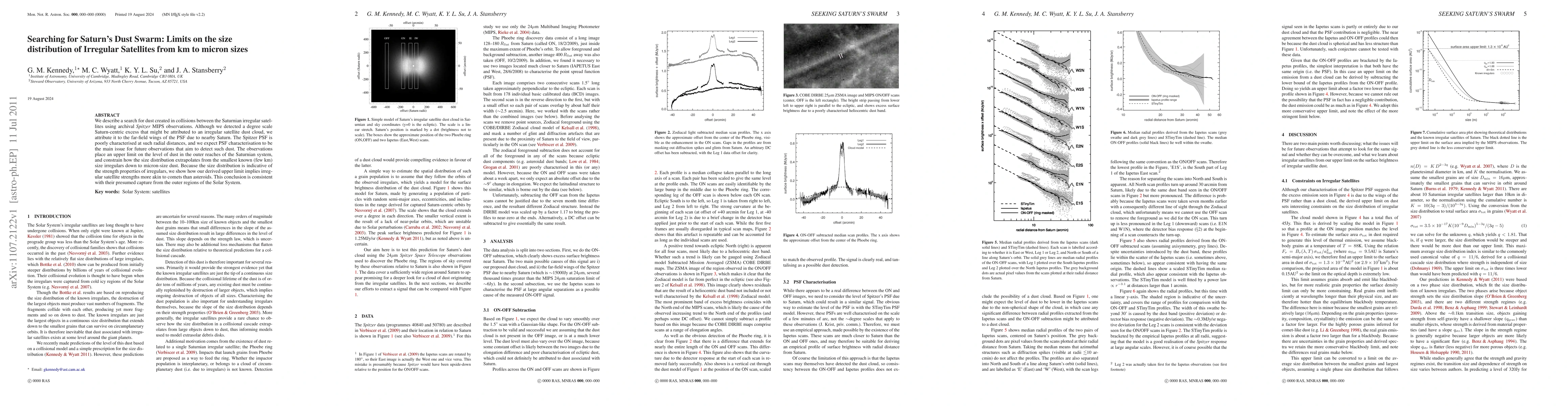 This research investigates Saturn's dust swarm from collisions among its irregular satellites using Spitzer MIPS data, finding no definitive evidence for a dust cloud but setting an upper limit on its size distribution. The study suggests that irregular satellites' strengths are more comet-like than asteroid-like, consistent with their presumed capture from the outer Solar System.
