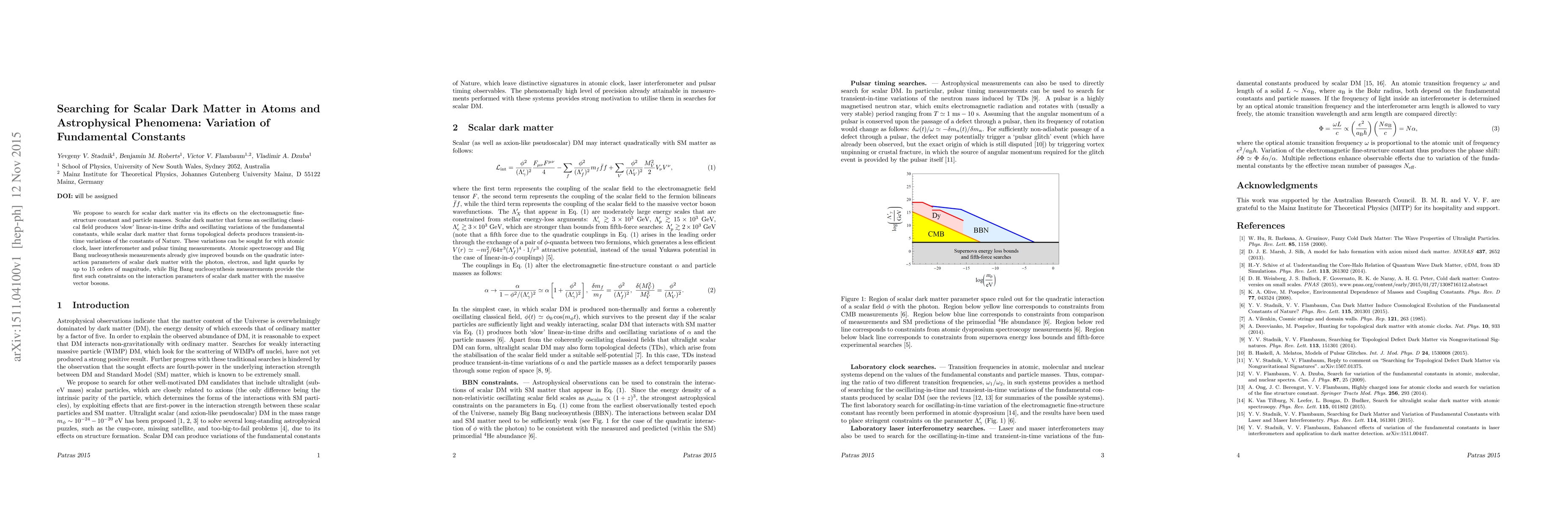 Research proposes searching for scalar dark matter using variations in fundamental constants, which could be detected through atomic clock measurements and Big Bang nucleosynthesis.