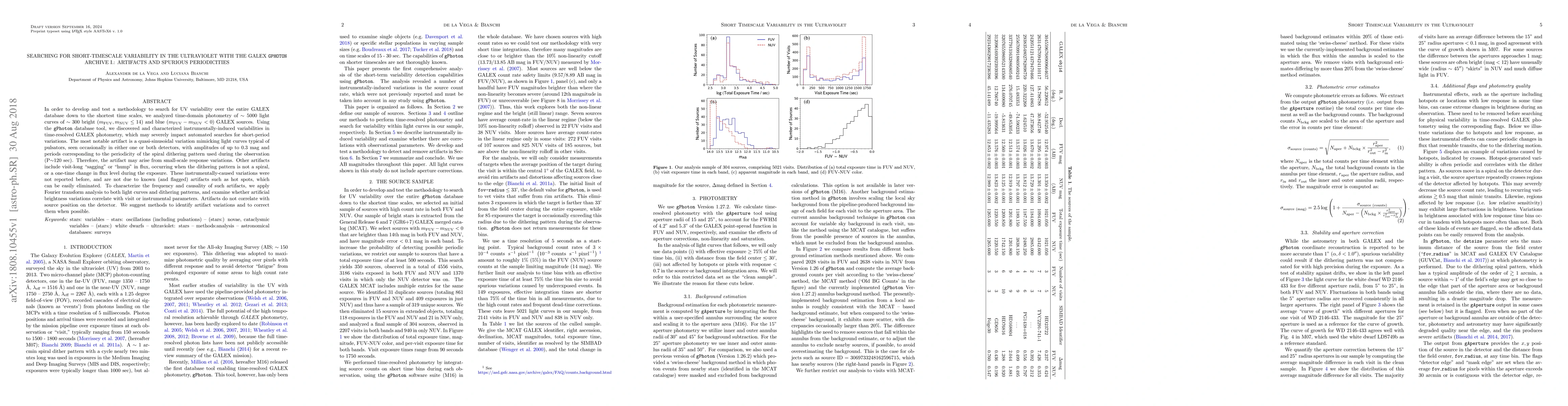 In order to develop and test a methodology to search for UV variability over the entire GALEX database down to the shortest time scales, we analyzed time-domain photometry of $\sim5000$ light curves of $\sim300$ bright $(m_{\rm{FUV}}, m_{\rm{NUV}} \leq 14)$ and blue $(m_{\rm{FUV}} - m_{\rm{NUV}} < 0)$ GALEX sources. Using the \gphoton \ database tool, we discovered and characterized instrumentally-induced variabilities in time-resolved GALEX photometry, which may severely impact automated searches for short-period variations. The most notable artifact is a quasi-sinusoidal variation mimicking light curves typical of pulsators, seen occasionally in either one or both detectors, with amplitudes of up to 0.3 mag and periods corresponding to the periodicity of the spiral dithering pattern used during the observation (P$\sim$120 sec). Therefore, the artifact may arise from small-scale response variations. Other artifacts include visit-long "sagging" or "hump" in flux, occurring when the dithering pattern is not a spiral, or a one-time change in flux level during the exposure. These instrumentally-caused variations were not reported before, and are not due to known (and flagged) artifacts such as hot spots, which can be easily eliminated. To characterize the frequency and causality of such artifacts, we apply Fourier transform analysis to both light curves and dithering patterns, and examine whether artificial brightness variations correlate with visit or instrumental parameters. Artifacts do not correlate with source position on the detector. We suggest methods to identify artifact variations and to correct them when possible.