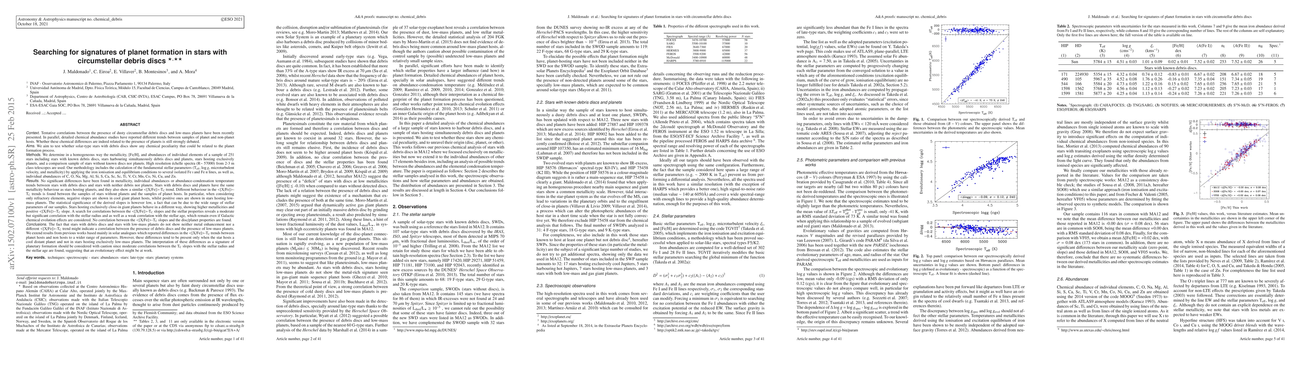 This study investigates the chemical abundances of 251 stars, including those with debris discs and planets, to determine if there are correlations between planet formation and stellar metallicity. Stars with debris discs and low-mass planets exhibit similar [Fe/H] behaviour and <[X/Fe]>-Tc trends compared to planet hosts, suggesting a potential link between debris discs and low-mass planets.