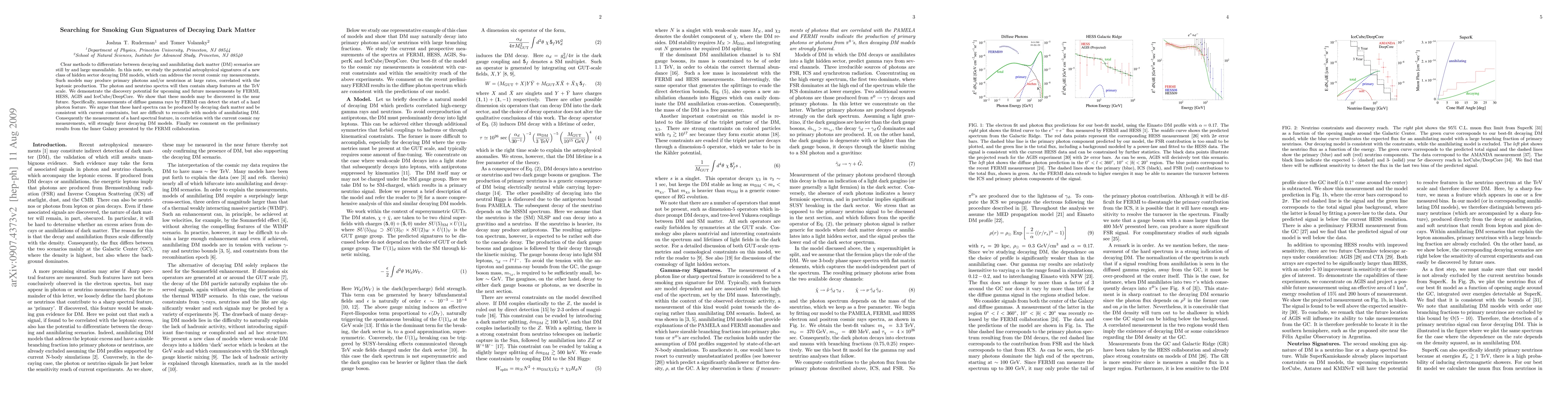Clear methods to differentiate between decaying and annihilating dark matter (DM) scenarios are still by and large unavailable. In this note, we study the potential astrophysical signatures of a new class of hidden sector decaying DM models, which can address the recent cosmic ray measurements. Such models may produce primary photons and/or neutrinos at large rates, correlated with the leptonic production. The photon and neutrino spectra will then contain sharp features at the TeV scale. We demonstrate the discovery potential for upcoming and future measurements by FERMI, HESS, AGIS and IceCube/DeepCore. We show that these models may be discovered in the near future. Specifically, measurements of diffuse gamma rays by FERMI can detect the start of a hard photon feature. We argue that these hard spectra can be produced by decaying dark matter and be consistent with current constraints, but are difficult to reconcile with models of annihilating DM. Consequently the measurement of a hard spectral feature, in correlation with the current cosmic ray measurements, will strongly favor decaying DM models. Finally we comment on the preliminary results from the Inner Galaxy presented by the FERMI collaboration.