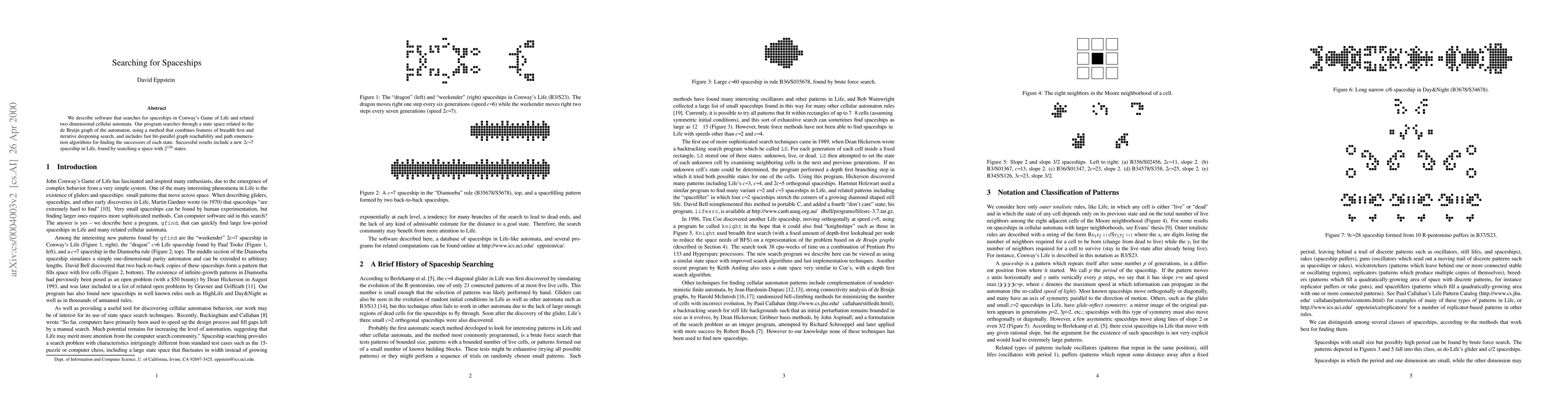 Researchers developed a software to search for spaceships in Conway's Game of Life, using a combination of breadth-first and iterative deepening search algorithms to explore a massive state space, leading to the discovery of a new 2c/7 spaceship with 2^126 states.