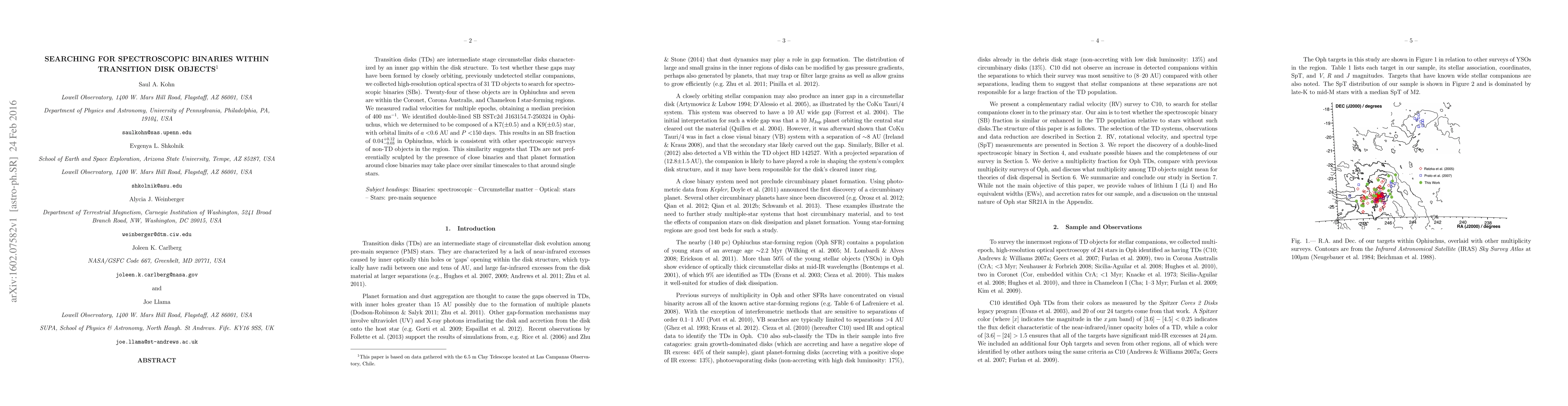 Transition disks (TDs) are intermediate stage circumstellar disks characterized by an inner gap within the disk structure. To test whether these gaps may have been formed by closely orbiting, previously undetected stellar companions, we collected high-resolution optical spectra of 31 TD objects to search for spectroscopic binaries (SBs). Twenty-four of these objects are in Ophiuchus and seven are within the Coronet, Corona Australis, and Chameleon I star-forming regions. We measured radial velocities for multiple epochs, obtaining a median precision of 400 ms$^{-1}$. We identified double-lined SB SSTc2d J163154.7-250324 in Ophiuchus, which we determined to be composed of a K7($\pm$0.5) and a K9($\pm$0.5) star, with orbital limits of $a<$0.6 AU and $P<$150 days. This results in an SB fraction of 0.04$^{+0.12}_{-0.03}$ in Ophiuchus, which is consistent with other spectroscopic surveys of non-TD objects in the region. This similarity suggests that TDs are not preferentially sculpted by the presence of close binaries and that planet formation around close binaries may take place over similar timescales to that around single stars.
