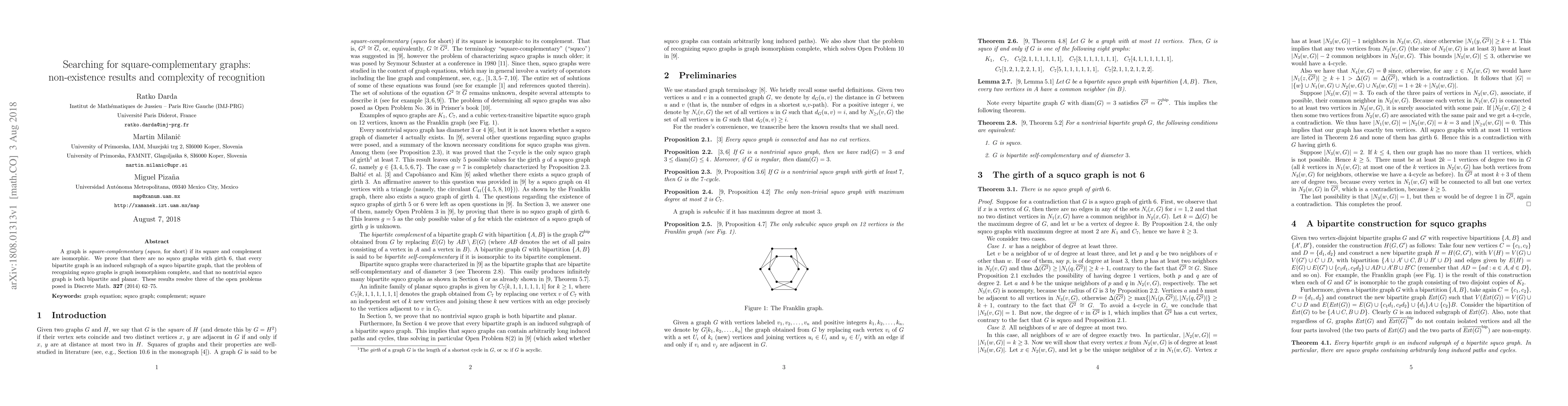 A graph is square-complementary (squco, for short) if its square and complement are isomorphic. We prove that there are no squco graphs with girth 6, that every bipartite graph is an induced subgraph of a squco bipartite graph, that the problem of recognizing squco graphs is graph isomorphism complete, and that no nontrivial squco graph is both bipartite and planar. These results resolve three of the open problems posed in Discrete Math. 327 (2014) 62-75.