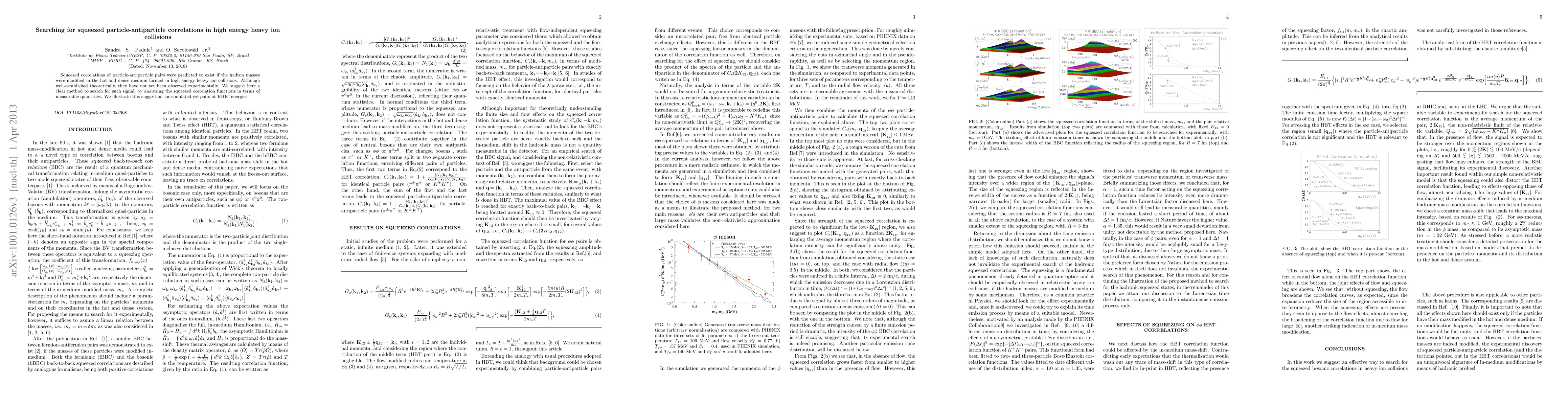 This paper proposes a method to detect squeezed particle-antiparticle correlations in high energy heavy ion collisions, which are predicted to arise from modified hadron masses in the hot, dense medium. The study suggests analyzing these correlations through measurable quantities and demonstrates this approach using simulated phi-phi pairs at RHIC energies.