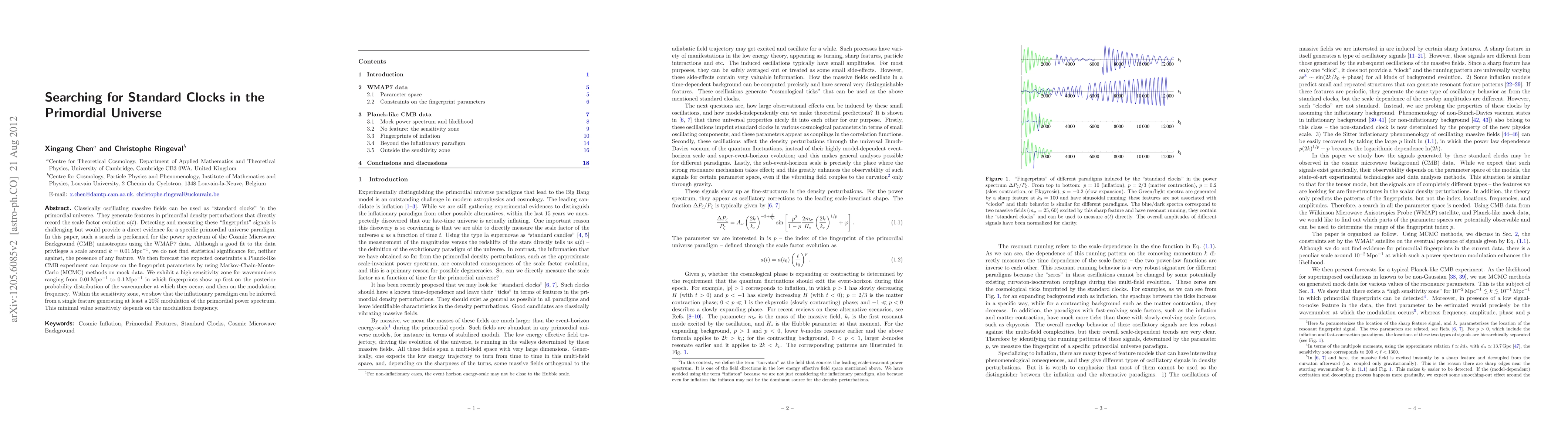 This paper investigates the potential of classical oscillating massive fields as "standard clocks" in the primordial universe, searching for their imprints in the CMB power spectrum using WMAP7 data. While a promising scale is identified, no conclusive evidence is found. The study forecasts that a future Planck-like CMB experiment could detect these fingerprints with high sensitivity, particularly in the range of 0.01 to 0.1 Mpc^(-1), allowing for the inference of the inflationary paradigm if a 20% modulation is observed.