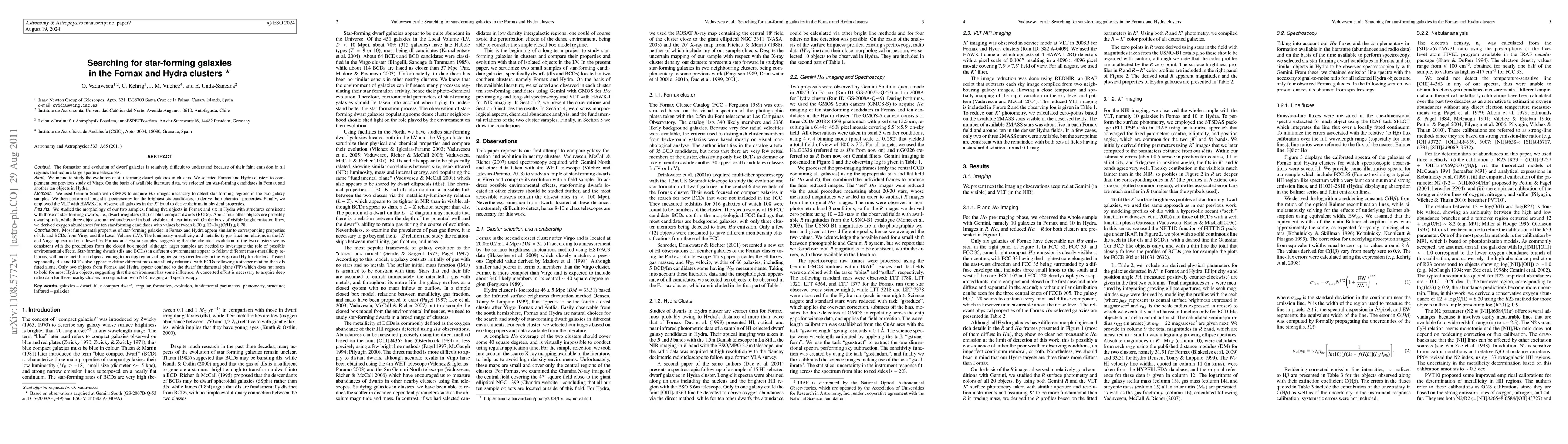 The formation and evolution of dwarf galaxies is relatively difficult to understand because of their faint emission in all regimes that require large aperture telescopes. We intend to study the evolution of star forming dwarf galaxies in clusters. We selected Fornax and Hydra clusters to complement our previous study of Virgo. On the basis of available literature data, we selected ten star-forming candidates in Fornax and another ten objects in Hydra. We used Gemini South with GMOS to acquire H-alpha images necessary to detect star-forming regions in the two galaxy samples. We then performed long-slit spectroscopy for the brightest six candidates, to derive their chemical properties. Finally, we employed the VLT with HAWK-I to observe all galaxies in the K' band to derive their main physical properties. We studied the morphology of our two samples, finding five objects in Fornax and six in Hydra with structures consistent with those of star-forming dwarfs, i.e., dwarf irregulars (dIs) or blue compact dwarfs (BCDs). About four other objects are probably dwarf spirals, while three objects remained undetected in both visible and near infrared. On the basis of visible bright emission lines, we derived oxygen abundances for ten star-forming candidates with values between 8.00 and 8.78. Most fundamental properties of star-forming galaxies in Fornax and Hydra appear similar to corresponding properties of dIs and BCDs from Virgo and the Local Volume (LV). The luminosity-metallicity and metallicity-gas fraction relations in the LV and Virgo appear to be followed by Fornax and Hydra samples, suggesting that the chemical evolution of the two clusters seems consistent with the predictions from the closed box model, although larger samples are needed to investigate the role of possible environmental effects. (CONTINUED)