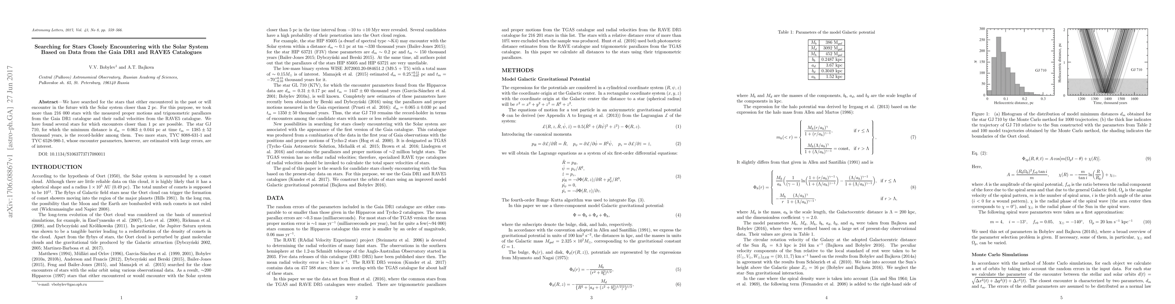 We have searched for the stars that either encountered in the past or will encounter in the future with the Solar system closer than 2 pc. For this purpose, we took more than 216 000 stars with the measured proper motions and trigonometric parallaxes from the Gaia DR1 catalogue and their radial velocities from the RAVE5 catalogue. We have found several stars for which encounters closer than 1 pc are possible. The star GJ 710, for which the minimum distance is d_m=0.063+/-0.044 pc at time t_m=1385+/-52 thousand years, is the record-holder among them. Two more stars, TYC 8088-631-1 and TYC 6528-980-1, whose encounter parameters, however, are estimated with large errors, are of interest.