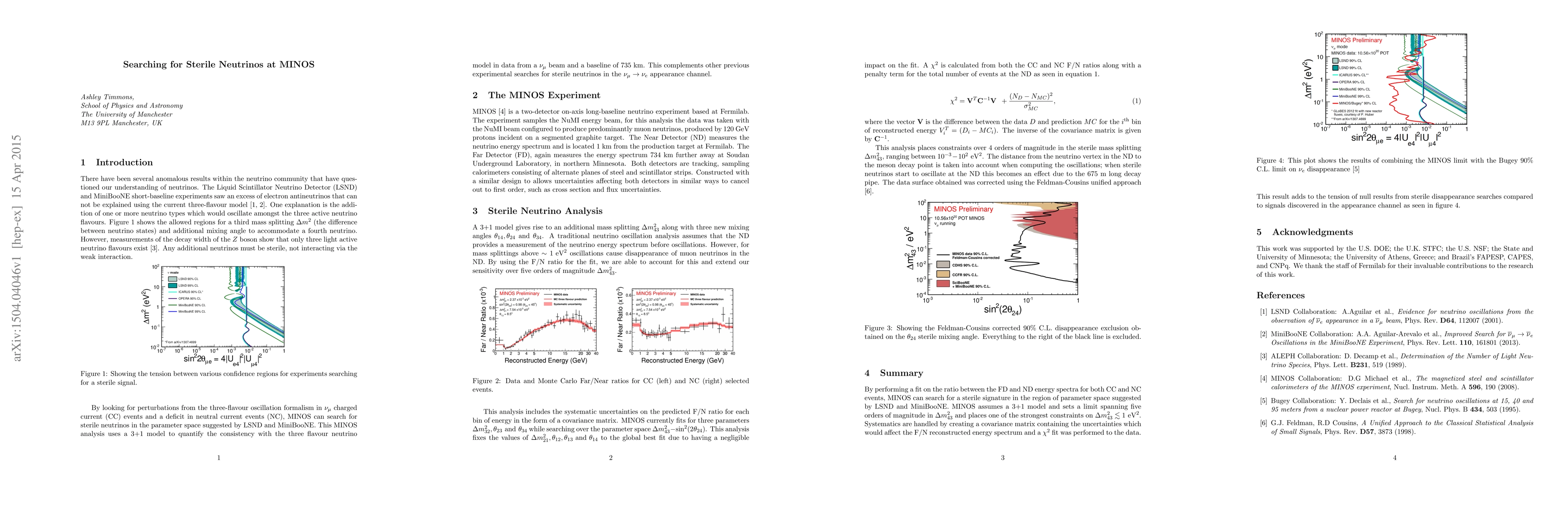 MINOS, a two-detector long-baseline neutrino experiment at Fermilab, uses the NuMI neutrino beam to study oscillations, particularly sensitive to sterile neutrinos through a large mass splitting. The experiment analyzes both charged-current numu and neutral current neutrino interactions in a 3+1 model, comparing Far Detector (734 km away) and Near Detector (1 km) data to search for sterile neutrino signatures suggested by LSND and MiniBooNE.