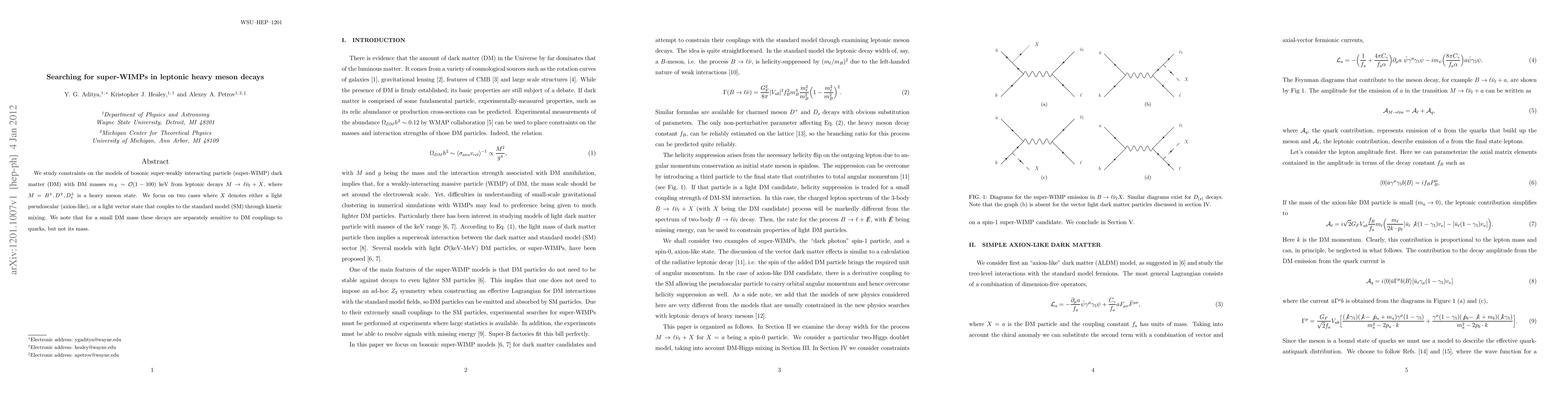This paper investigates constraints on bosonic super-WIMP dark matter models through leptonic decays of heavy mesons, specifically $B^\pm$, $D^\pm$, and $D_s^\pm$, into leptons and either axion-like particles or light vector states. It highlights the sensitivity of these decays to dark matter couplings to quarks, particularly for small dark matter masses.