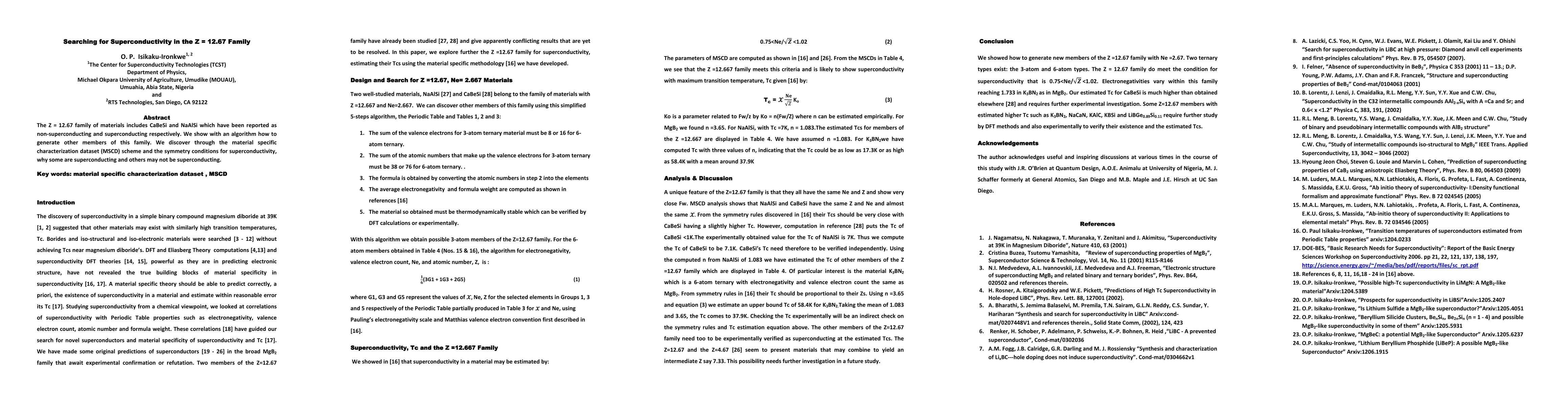 The Z = 12.67 family of materials includes CaBeSi and NaAlSi which have been reported as non-superconducting and superconducting respectively. We show with an algorithm how to generate other members of this family. We discover through the material specific characterization dataset (MSCD) scheme and the symmetry conditions for superconductivity, why some are superconducting and others may not be superconducting.We estimate too the Tcs of members of this interesting family of materials.