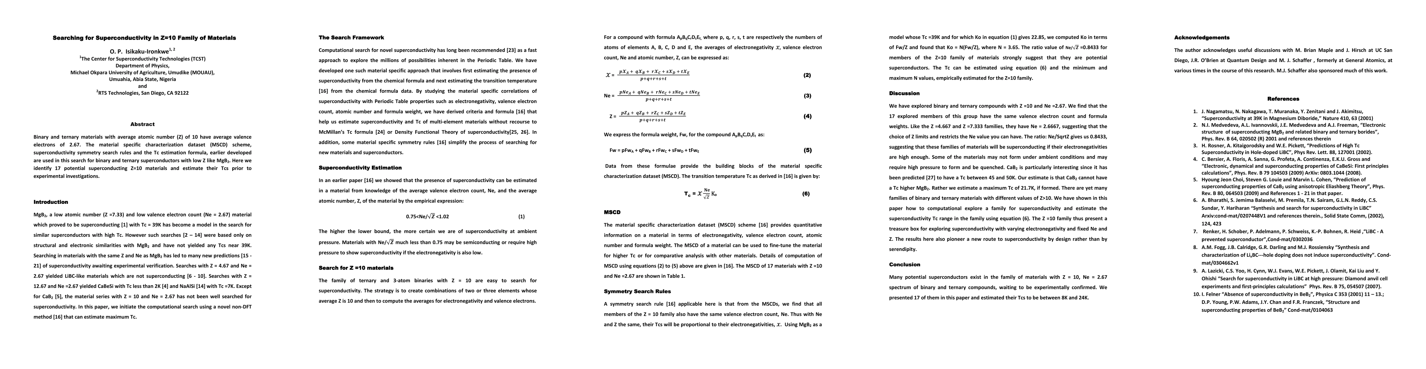 Binary and ternary materials with average atomic number (Z) of 10 have average valence electrons of 2.67. The material specific characterization dataset (MSCD) scheme, superconductivity symmetry search rules and the Tc estimation formula, earlier developed are used in this search for binary and ternary superconductors with low Z like MgB2. Here we identify 17 potential superconducting Z=10 materials and estimate their Tcs prior to experimental investigations.