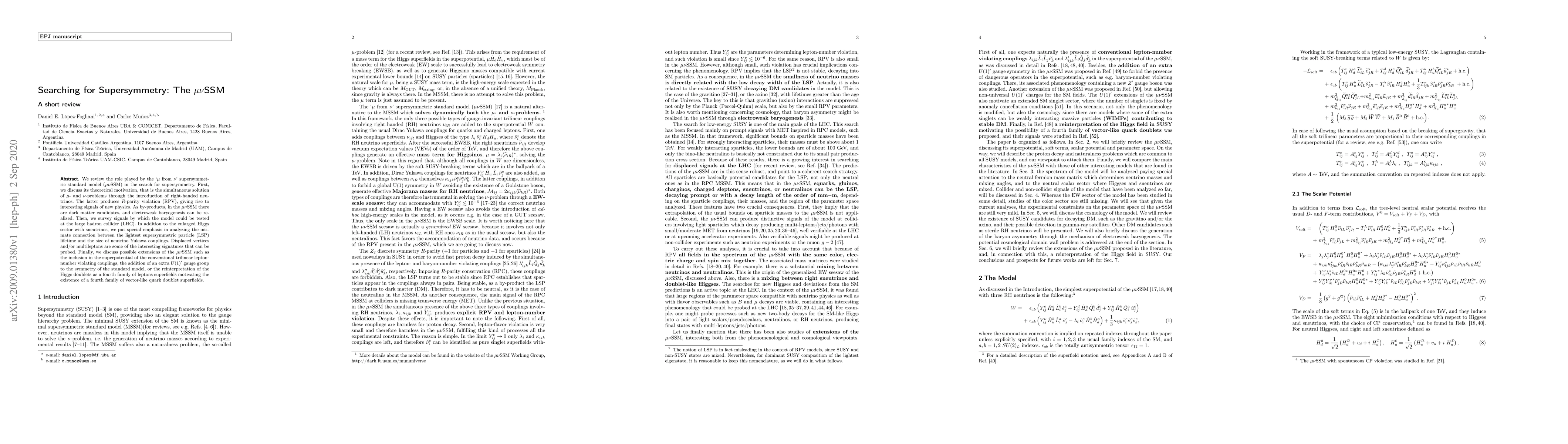 We review the role played by the '$\mu$ from $\nu$' supersymmetric standard model ($\mu \nu$SSM) in the search for supersymmetry. First, we discuss its theoretical motivation, that is the simultaneous solution of $\mu$- and $\nu$-problems through the introduction of right-handed neutrinos. The latter produces $R$-parity violation (RPV), giving rise to interesting signals of new physics. As by-products, in the $\mu\nu$SSM there are dark matter candidates, and electroweak baryogenesis can be realized. Then, we survey signals by which the model could be tested at the large hadron collider (LHC). In addition to the enlarged Higgs sector with sneutrinos, we put special emphasis in analyzing the intimate connection between the lightest supersymmetric particle (LSP) lifetime and the size of neutrino Yukawa couplings. Displaced vertices and/or multileptons are some of the interesting signatures that can be probed. Finally, we discuss possible extensions of the $\mu\nu$SSM such as the inclusion in the superpotential of the conventional trilinear lepton-number violating couplings, the addition of an extra $U(1)'$ gauge group to the symmetry of the standard model, or the reinterpretation of the Higgs doublets as a fourth family of leptons superfields motivating the existence of a fourth family of vector-like quark doublet superfields.