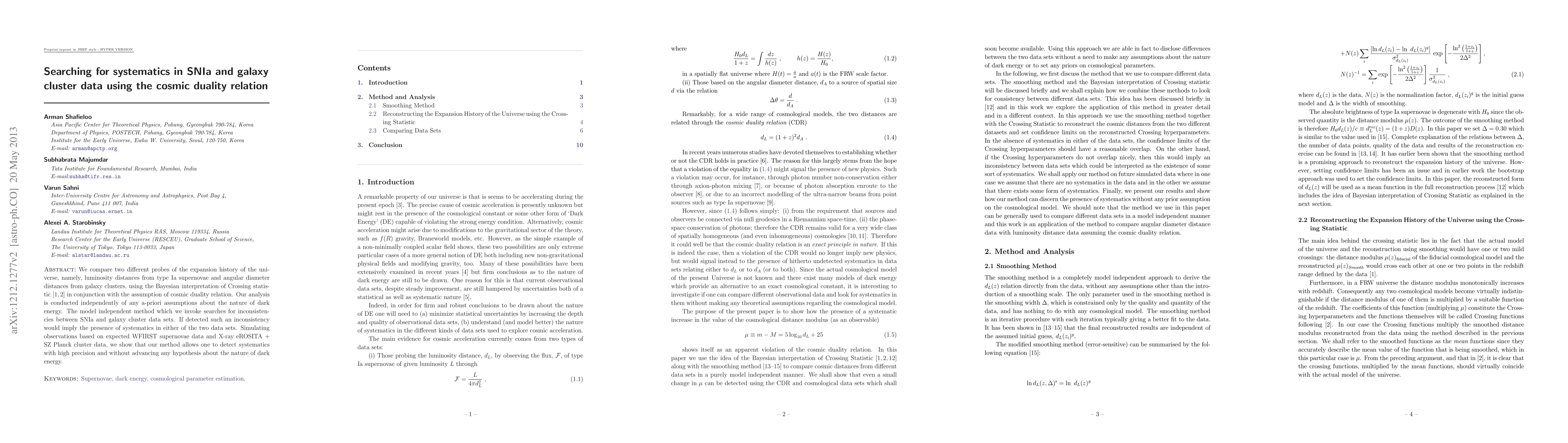 We compare two different probes of the expansion history of the universe, namely, luminosity distances from type Ia supernovae and angular diameter distances from galaxy clusters, using the Bayesian interpretation of Crossing statistic [1, 2] in conjunction with the assumption of cosmic duality relation. Our analysis is conducted independently of any a-priori assumptions about the nature of dark energy. The model independent method which we invoke searches for inconsistencies between SNIa and galaxy cluster data sets. If detected such an inconsistency would imply the presence of systematics in either of the two data sets. Simulating observations based on expected WFIRST supernovae data and X-ray eROSITA + SZ Planck cluster data, we show that our method allows one to detect systematics with high precision and without advancing any hypothesis about the nature of dark energy.