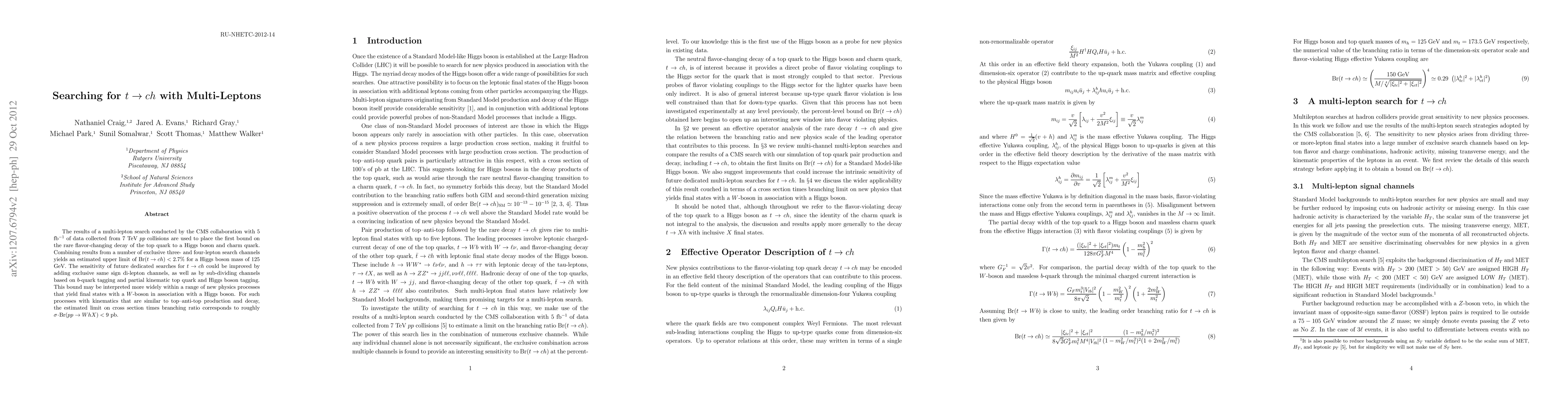 The results of a multi-lepton search conducted by the CMS collaboration with 5 fb$^{-1}$ of data collected from 7 TeV $pp$ collisions are used to place the first bound on the rare flavor-changing decay of the top quark to a Higgs boson and charm quark. Combining results from a number of exclusive three- and four-lepton search channels yields an estimated upper limit of ${\rm Br}(t \to ch) < 2.7%$ for a Higgs boson mass of 125 GeV. The sensitivity of future dedicated searches for $t \to c h$ could be improved by adding exclusive same sign di-lepton channels, as well as by sub-dividing channels based on $b$-quark tagging and partial kinematic top quark and Higgs boson tagging. This bound may be interpreted more widely within a range of new physics processes that yield final states with a $W$-boson in association with a Higgs boson. For such processes with kinematics that are similar to top--anti-top production and decay, the estimated limit on cross section times branching ratio corresponds to roughly $\sigma \cdot {\rm Br}(pp \to WhX) < 9$ pb.