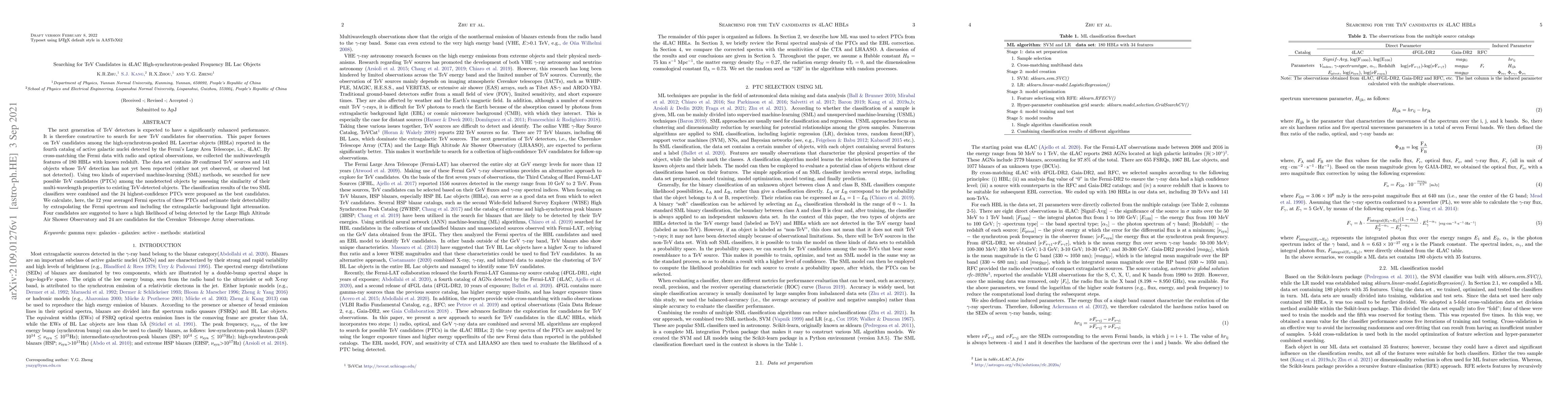 The next generation of TeV detectors is expected to have a significantly enhanced performance. It is therefore constructive to search for new TeV candidates for observation. This paper focuses on TeV candidates among the high-synchrotron-peaked BL Lacertae objects (HBLs) reported in the fourth catalog of active galactic nuclei detected by the Fermi's Large Area Telescope, i.e., 4LAC. By cross-matching the Fermi data with radio and optical observations, we collected the multiwavelength features of 180 HBLs with known redshift. The data set contains 39 confirmed TeV sources and 141 objects whose TeV detection has not yet been reported (either not yet observed, or observed but not detected). Using two kinds of supervised machine-learning (SML) methods, we searched for new possible TeV candidates (PTCs) among the nondetected objects by assessing the similarity of their multi-wavelength properties to existing TeV-detected objects. The classification results of the two SML classifiers were combined and the 24 highest-confidence PTCs were proposed as the best candidates. We calculate, here, the 12 year averaged Fermi spectra of these PTCs and estimate their detectability by extrapolating the Fermi spectrum and including the extragalactic background light attenuation. Four candidates are suggested to have a high likelihood of being detected by the Large High Altitude Air Shower Observatory and 24 are candidates for the Cerenkov Telescope Array observations.