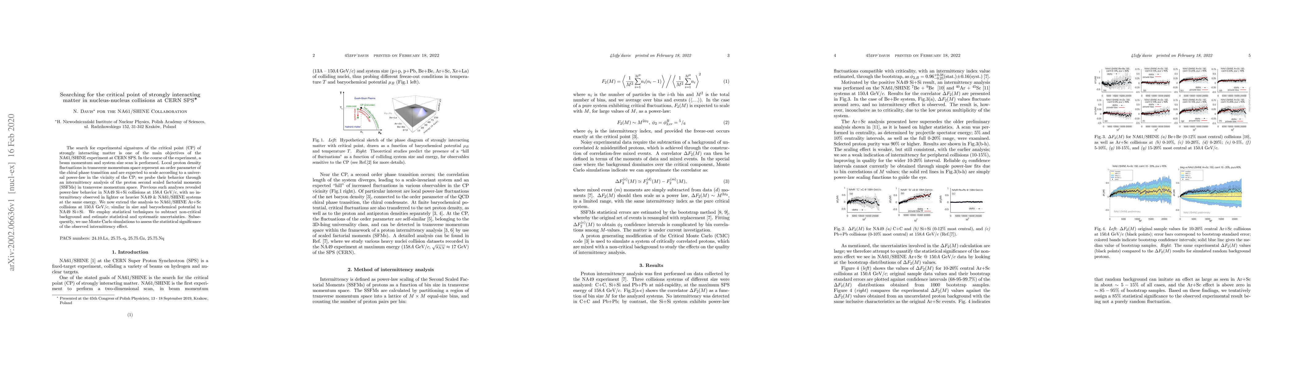 This paper investigates the critical point of strongly interacting matter in nucleus-nucleus collisions at CERN SPS using the NA61/SHINE experiment. It analyzes proton density fluctuations via intermittency in transverse momentum space to detect signatures of the chiral phase transition, extending previous findings from NA49 Si+Si collisions to NA61/SHINE Ar+Sc collisions.