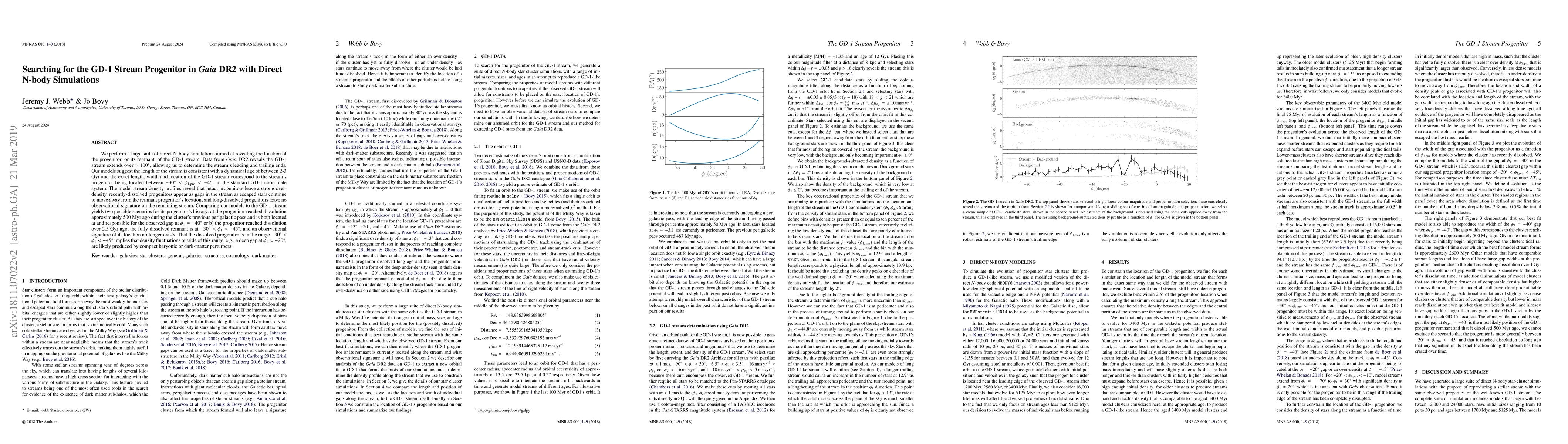 We perform a large suite of direct N-body simulations aimed at revealing the location of the progenitor, or its remnant, of the GD-1 stream. Data from \gaia\ DR2 reveals the GD-1 stream extends over $\approx 100^\circ$, allowing us to determine the stream's leading and trailing ends. Our models suggest the length of the stream is consistent with a dynamical age of between 2-3 Gyr and the exact length, width and location of the GD-1 stream correspond to the stream's progenitor being located between $-30^\circ < \phi_{1,\mathrm{pro}} < -45^{\circ}$ in the standard GD-1 coordinate system. The model stream density profiles reveal that intact progenitors leave a strong over-density, recently-dissolved progenitors appear as gaps in the stream as escaped stars continue to move away from the remnant progenitor's location, and long-dissolved progenitors leave no observational signature on the remaining stream. Comparing our models to the GD-1 stream yields two possible scenarios for its progenitor's history: a) the progenitor reached dissolution approximately 500 Myr ago during the cluster's previous perigalactic pass and is both located at and responsible for the observed gap at $\phi_1=-40^{\circ}$ or b) the progenitor reached dissolution over 2.5 Gyr ago, the fully-dissolved remnant is at $-30^\circ < \phi_1 < -45^{\circ}$, and an observational signature of its location no longer exists. That the dissolved progenitor is in the range $-30^\circ < \phi_1 < -45^{\circ}$ implies that density fluctuations outside of this range, e.g., a deep gap at $\phi_1 \approx -20^\circ$, are likely produced by compact baryonic or dark-matter perturbers.