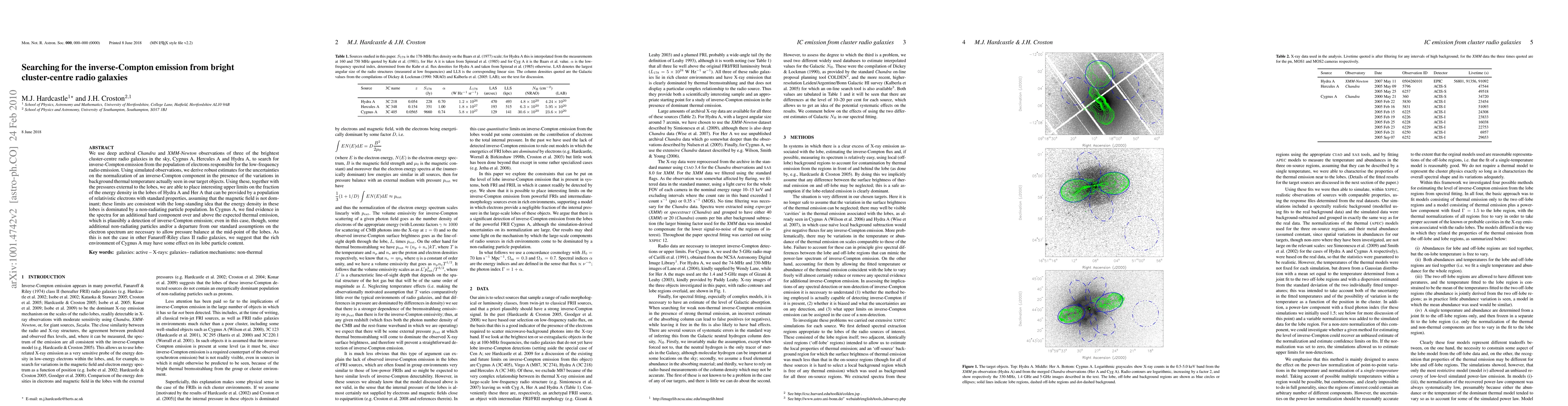 This paper investigates inverse-Compton emission in three bright cluster-centre radio galaxies using deep X-ray observations, finding evidence for such emission in Cygnus A but placing upper limits on its contribution in Hydra A and Hercules A. The results suggest that Cygnus A's unique environment may influence its radio lobe particle content.