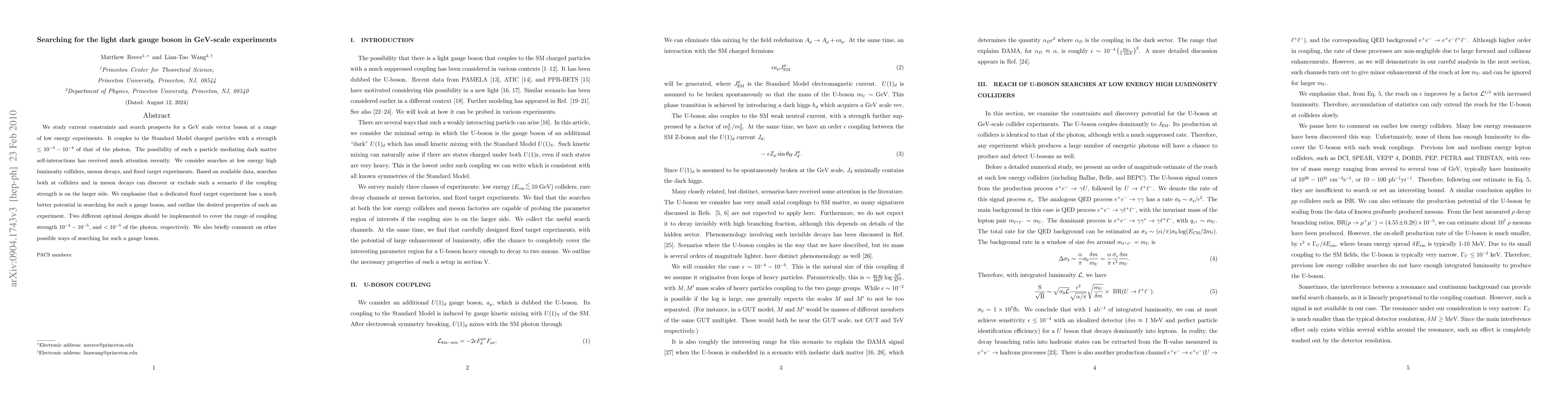 We study current constraints and search prospects for a GeV scale vector boson at a range of low energy experiments. It couples to the Standard Model charged particles with a strength <= 10^-3 to 10^-4 of that of the photon. The possibility of such a particle mediating dark matter self-interactions has received much attention recently. We consider searches at low energy high luminosity colliders, meson decays, and fixed target experiments. Based on available data, searches both at colliders and in meson decays can discover or exclude such a scenario if the coupling strength is on the larger side. We emphasize that a dedicated fixed target experiment has a much better potential in searching for such a gauge boson, and outline the desired properties of such an experiment. Two different optimal designs should be implemented to cover the range of coupling strength 10^-3 to 10^-5, and < 10^-5 of the photon, respectively. We also briefly comment on other possible ways of searching for such a gauge boson.