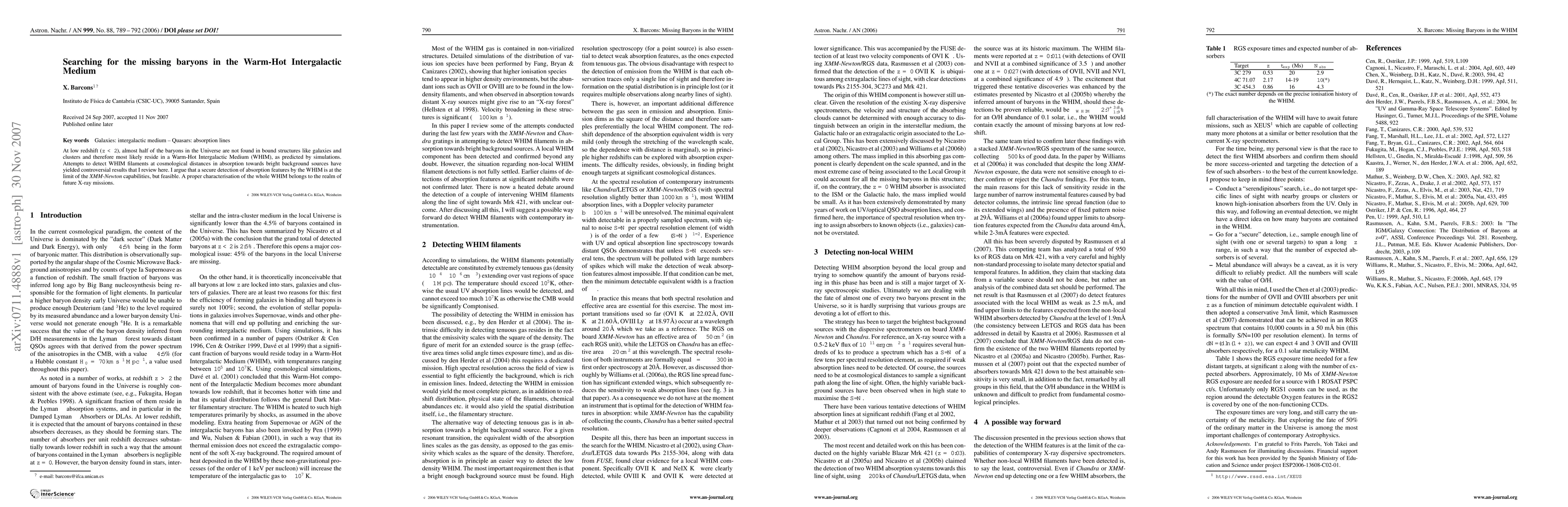 At low redshift (z<2), almost half of the baryons in the Universe are not found in bound structures like galaxies and clusters and therefore most likely reside in a Warm-Hot Intergalactic Medium (WHIM), as predicted by simulations. Attempts to detect WHIM filaments at cosmological distances in absorption towards bright background sources have yielded controversial results that I review here. I argue that a secure detection of absorption features by the WHIM is at the limit of the XMM-Newton capabilities, but feasible. A proper characterisation of the whole WHIM belongs to the realm of future X-ray missions.