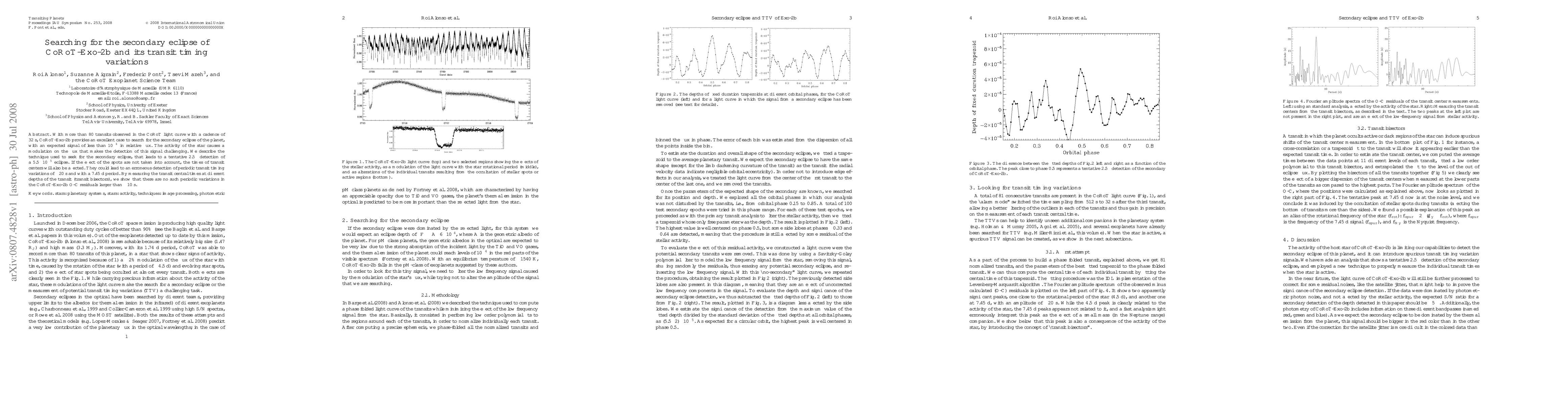 This paper investigates the secondary eclipse of the exoplanet CoRoT-Exo-2b, observing over 80 transits with a high cadence. A tentative 2.5 sigma detection of a secondary eclipse signal is reported, despite stellar activity complicating the analysis. The study also rules out periodic transit timing variations caused by stellar spots.