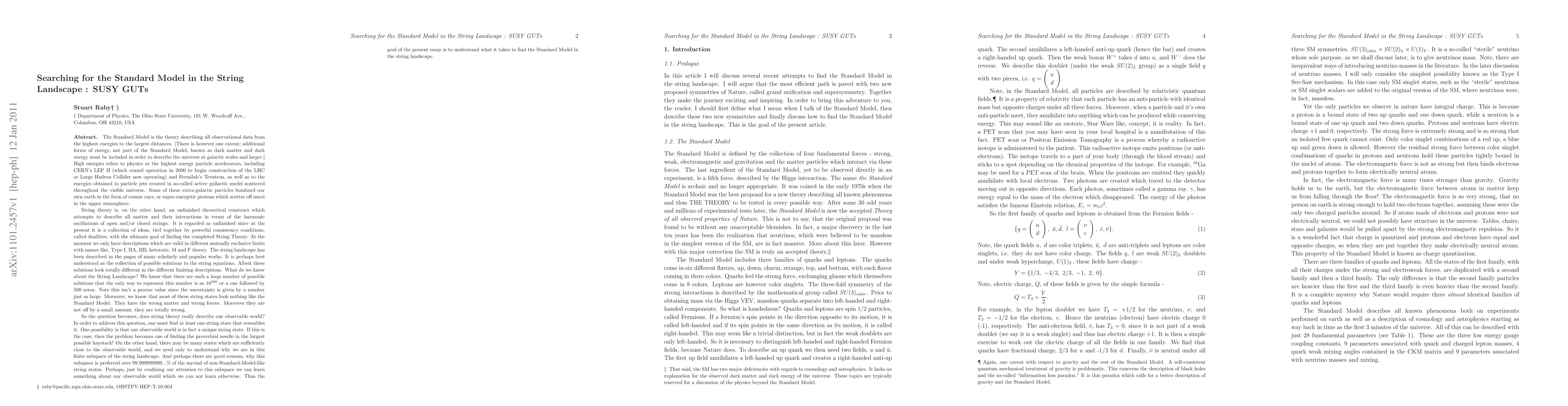This paper reviews the components required to identify the Standard Model within the vast string landscape, focusing on the role of supersymmetric Grand Unified Theories (SUSY GUTs) in this search. It highlights the potential pathways and theoretical frameworks that could lead to uncovering the Standard Model's realization in string theory.